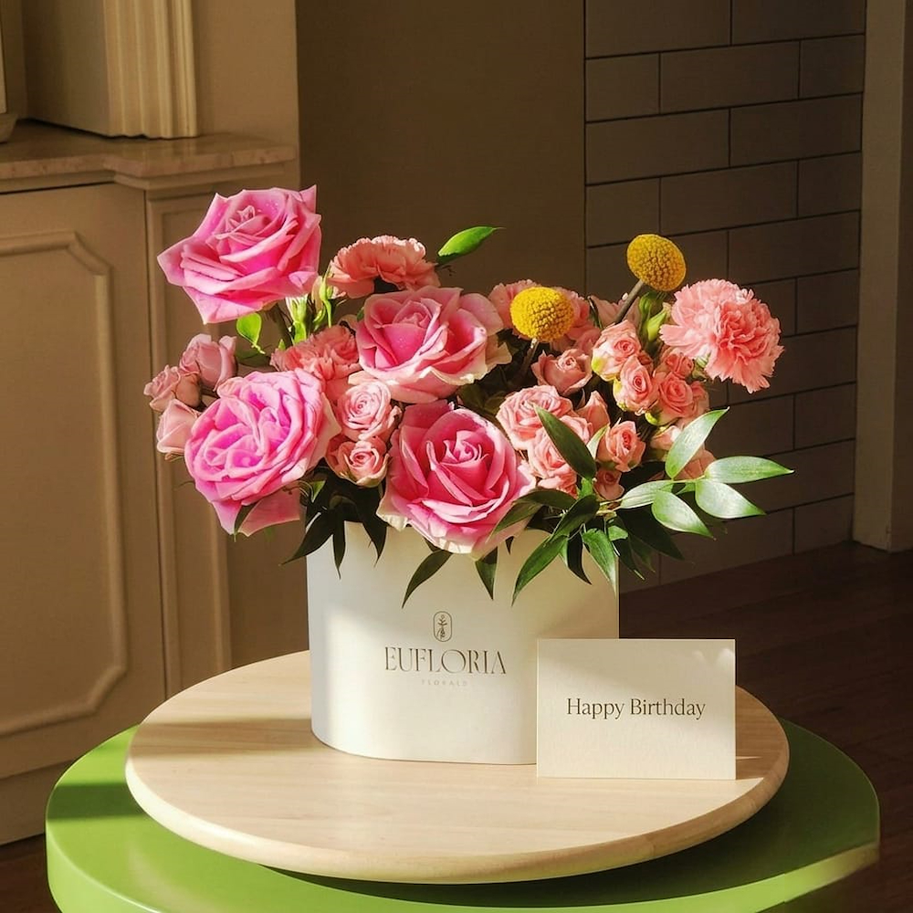 This box features 4 pink roses, 4 pink carnations, 2 craspedia, 6 pink baby roses, and Italian ruscus.