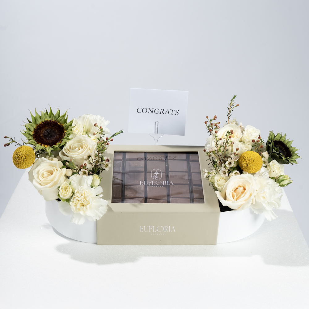 A sophisticated box with 50 pieces of premium chocolate squares arranged in two generous levels, surrounded by an elegant creamy white mix. The arrangement includes cream roses, white carnations, white waxflower, yellow craspedia, and accents of petal less sunflowers revealing dark centers.