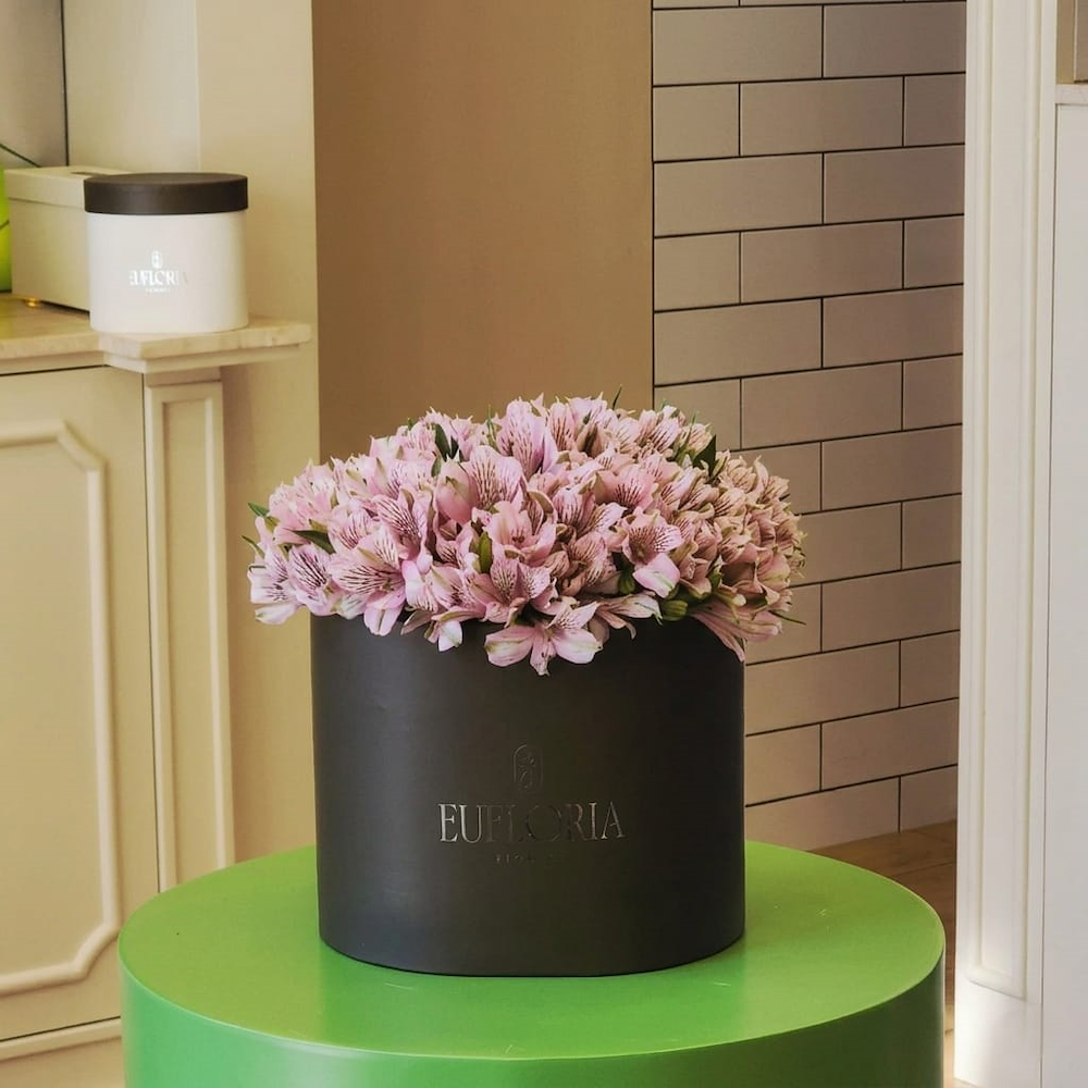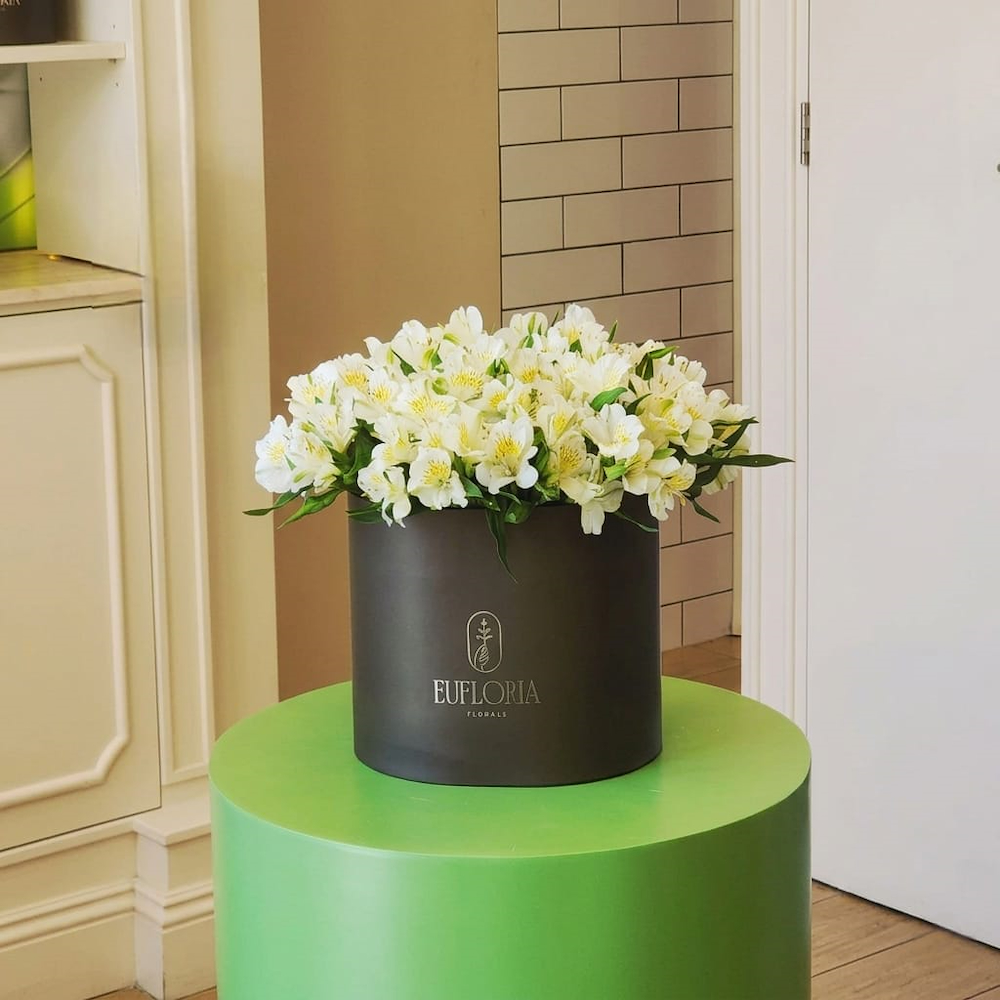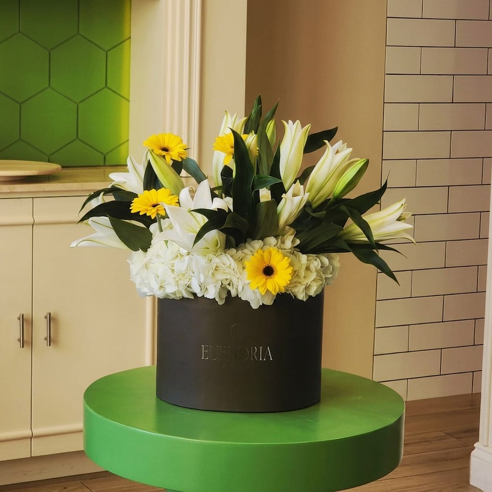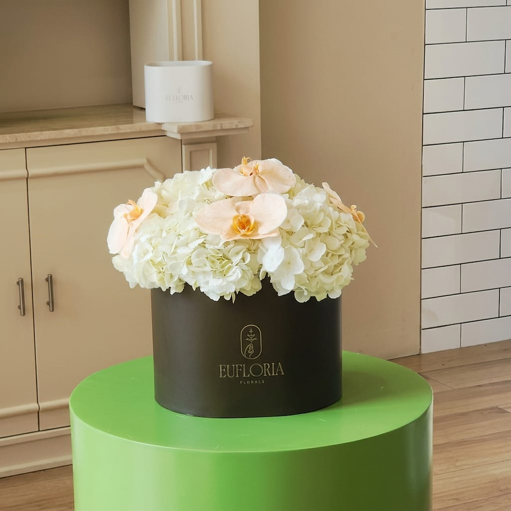 A bouquet containing hydrangeas, gerberas, and alstromerias, arranged in a premium olive box.