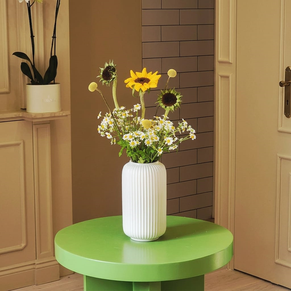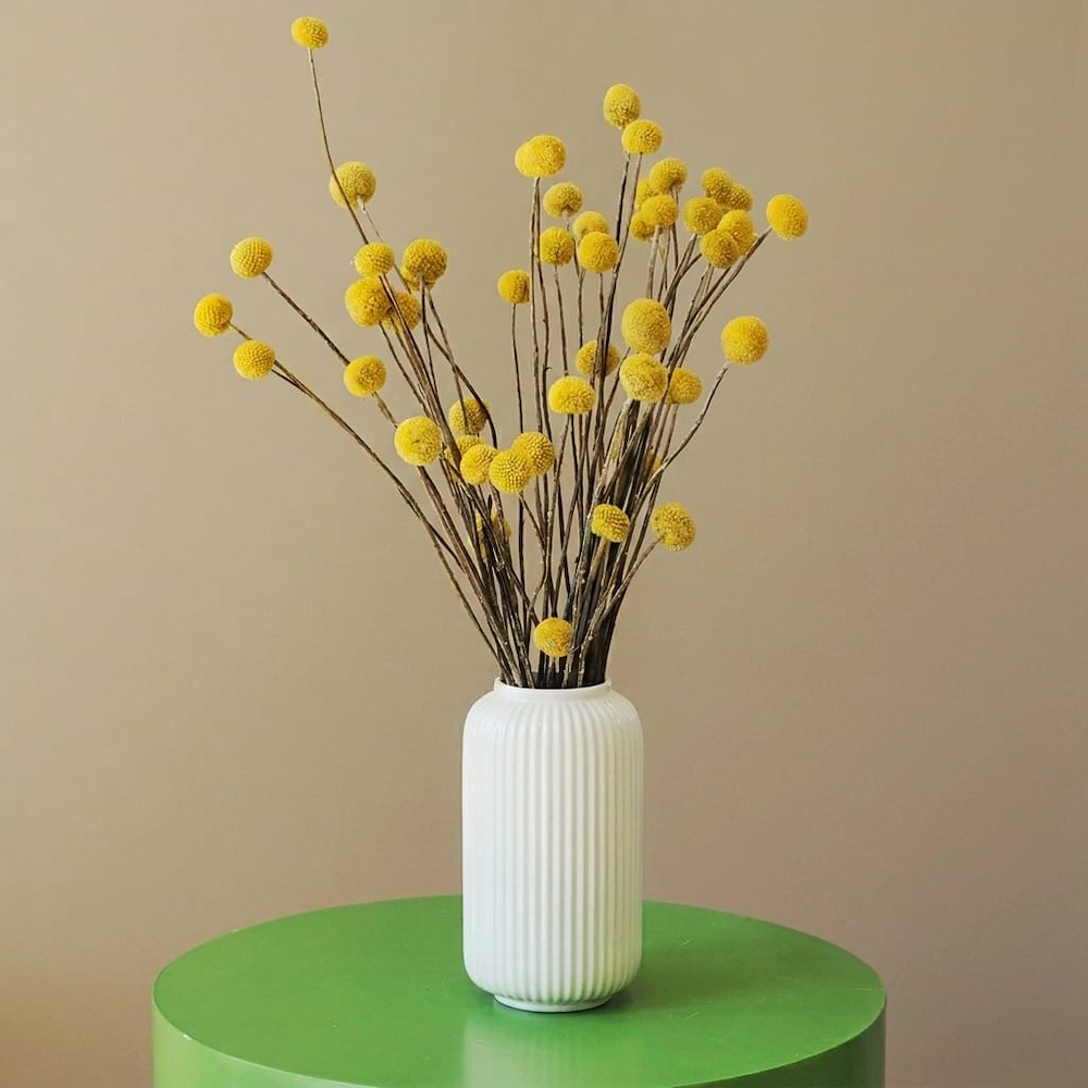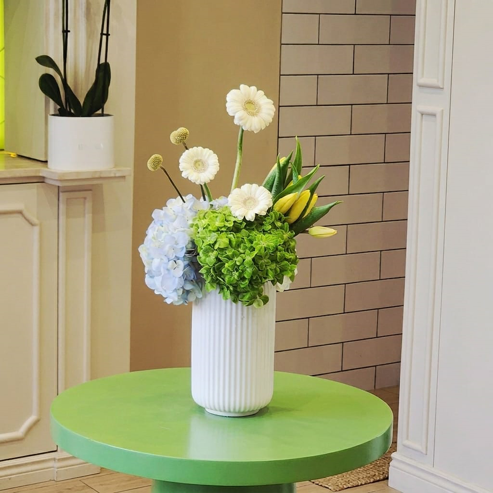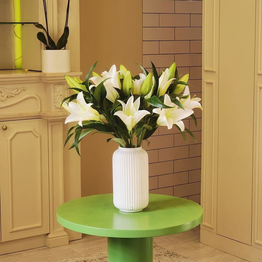 Mini orchid with one pot and two stems in a warm orange shade, with the box decorated using colored stones.