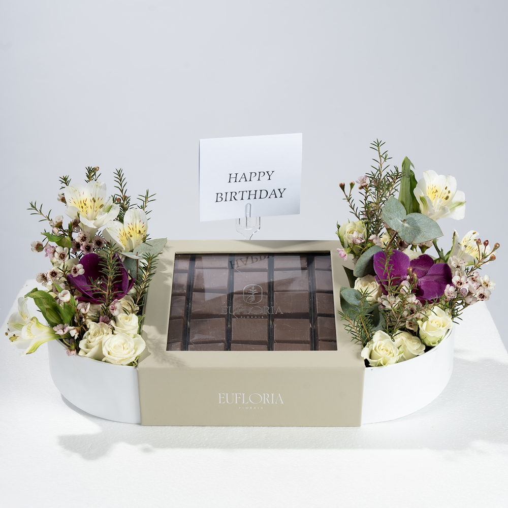 An exotic box with 50 pieces of premium chocolate squares arranged in two generous levels, surrounded by a striking mix of white, green, and deep jewel tones. The arrangement includes cream white roses, white alstroemeria, pink waxflower, green eucalyptus, and bold accents of deep purple magenta orchid blooms.