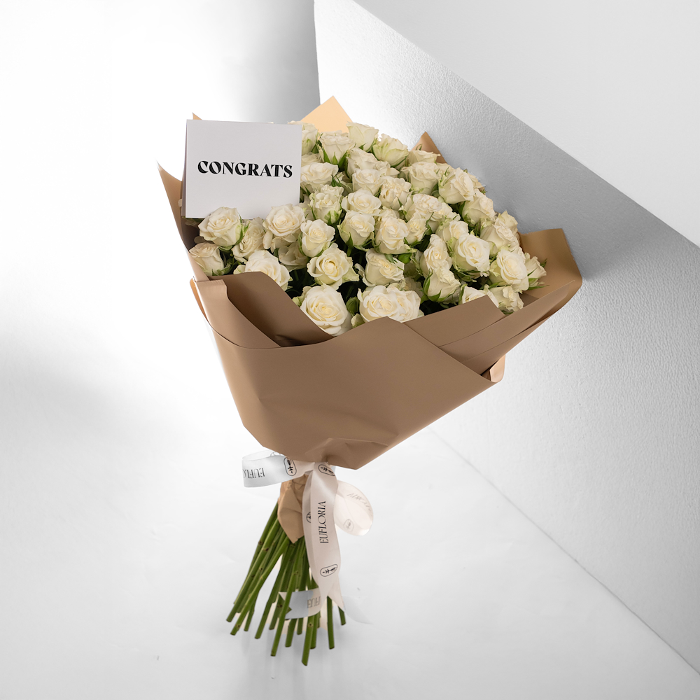 An elegant bouquet with a special bag featuring 25 delicate white baby roses and greens.