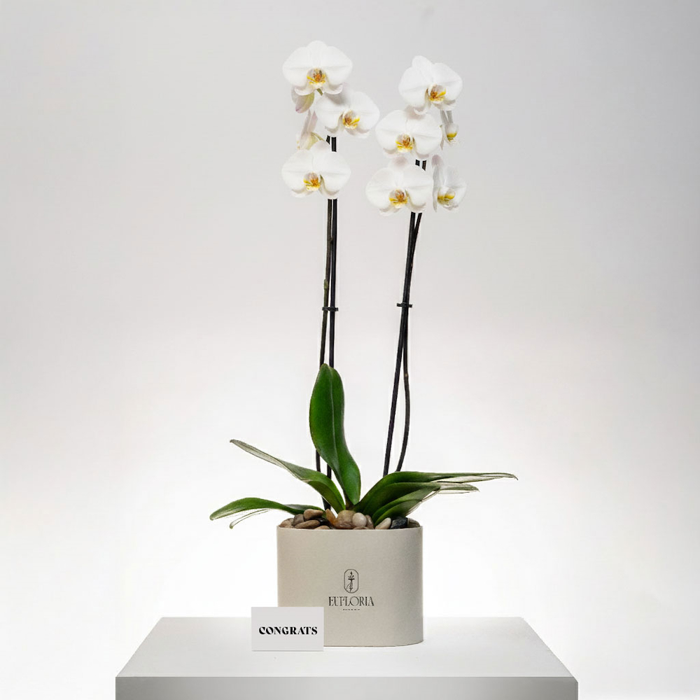 Mini orchid with one pot and two stems in pure white, with the box decorated using colored stones.