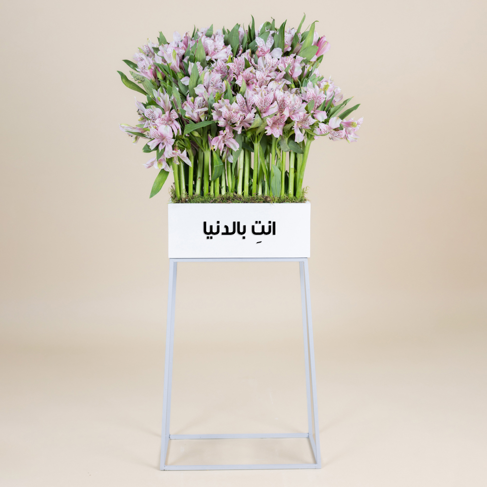 A stand filled with pink alstroemeria flowers.