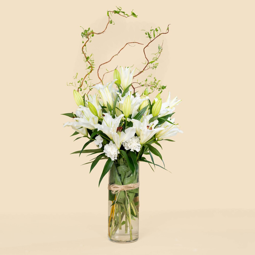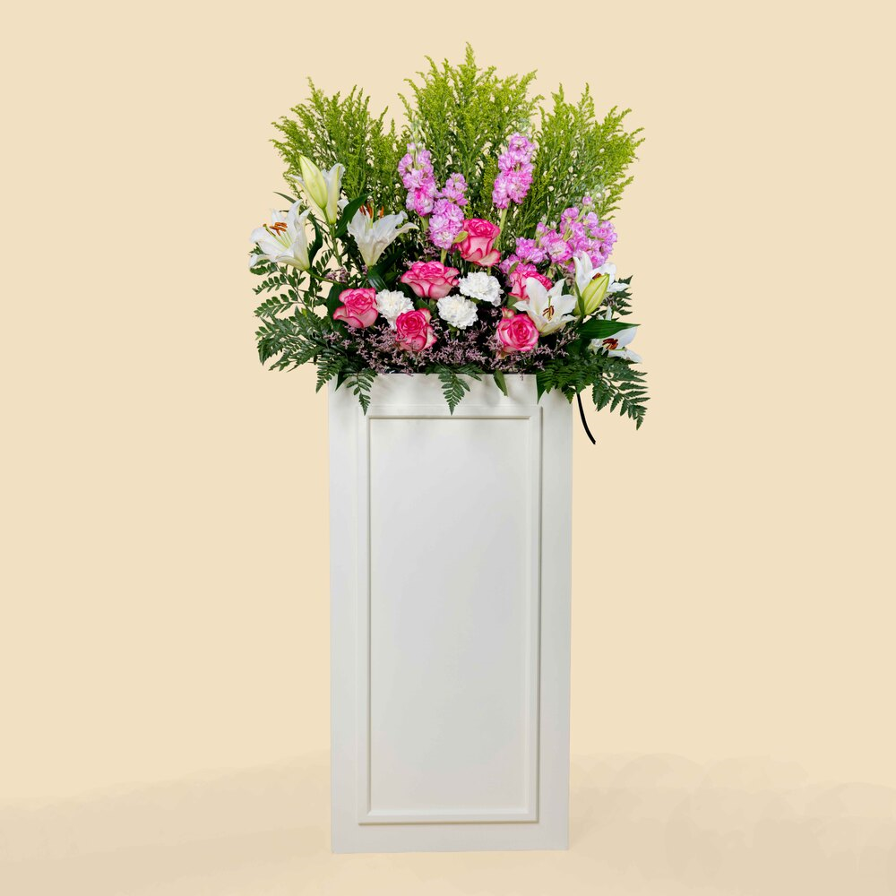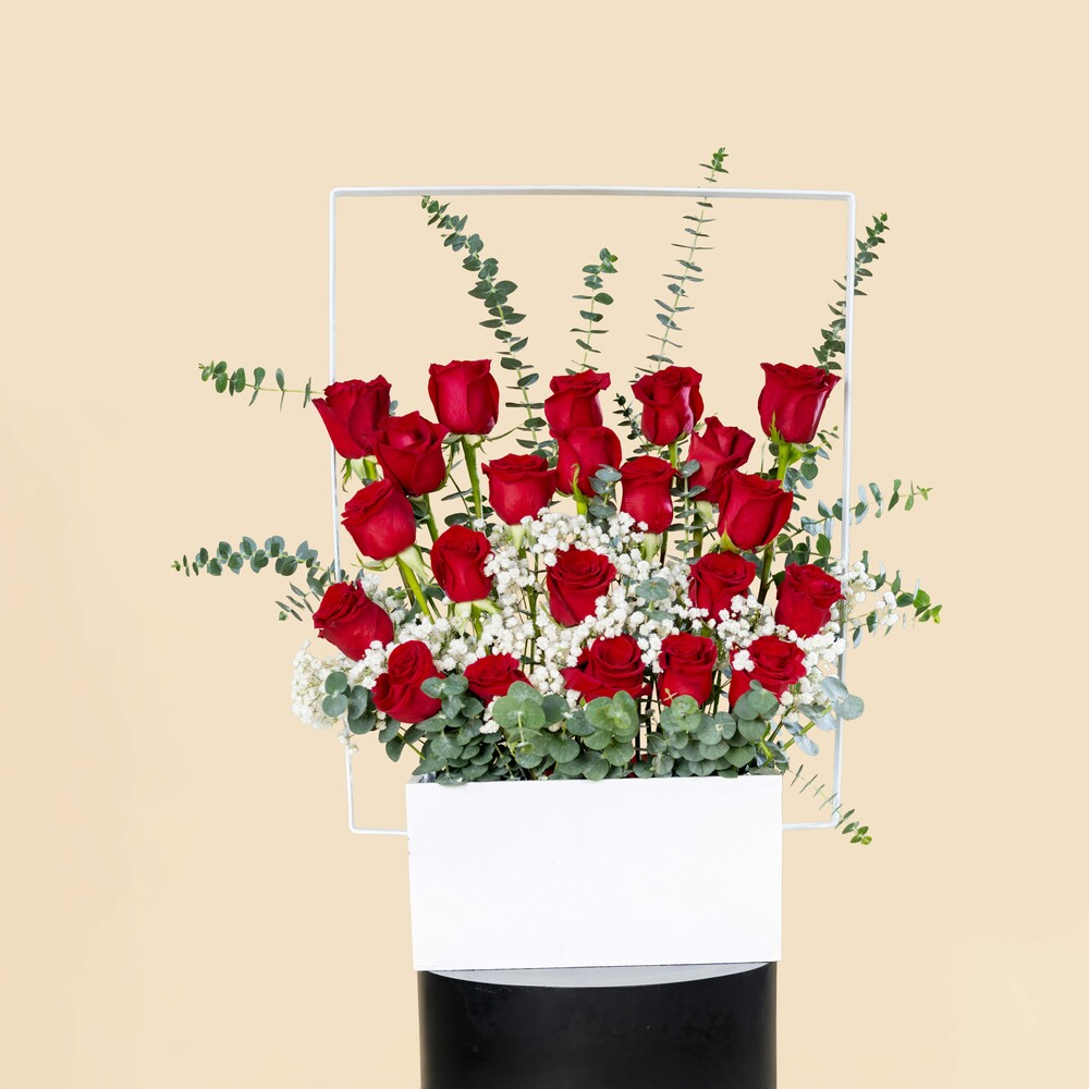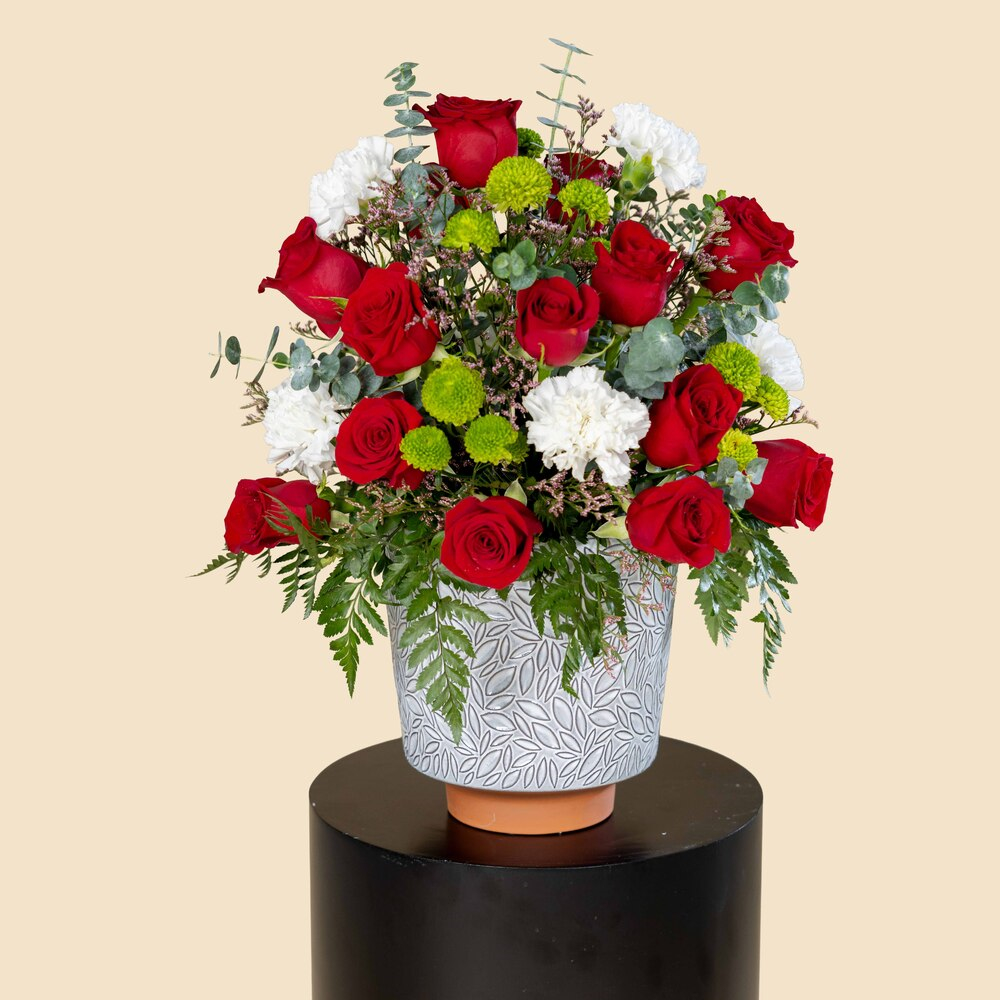 A stand filled with roses, gerberas and eucalyptus.