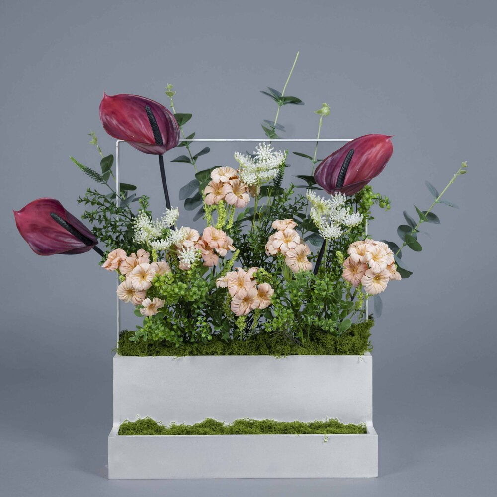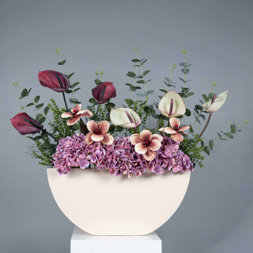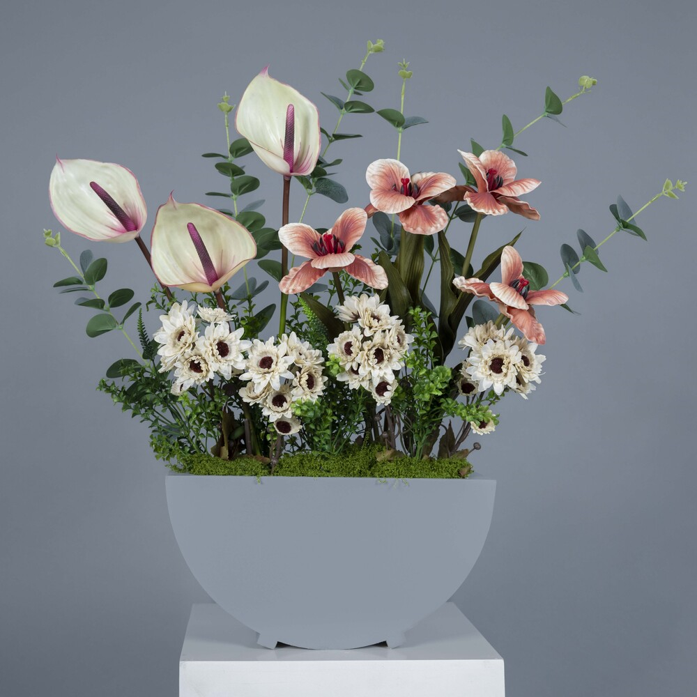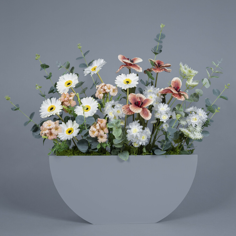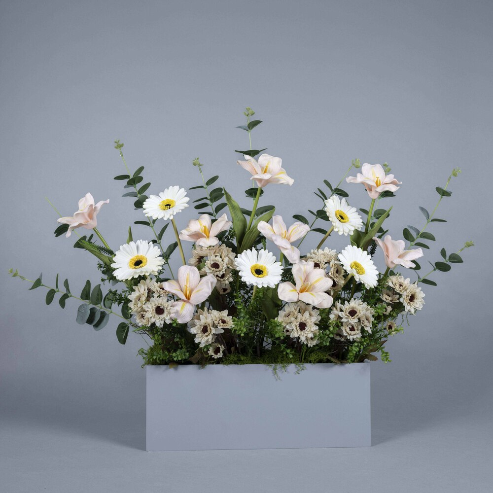 An elegant floral arrangement in soft tones, featuring natural and artificial white roses, peach chrysanthemums, and white gerberas with a gentle green touch, presented in a white wooden box.