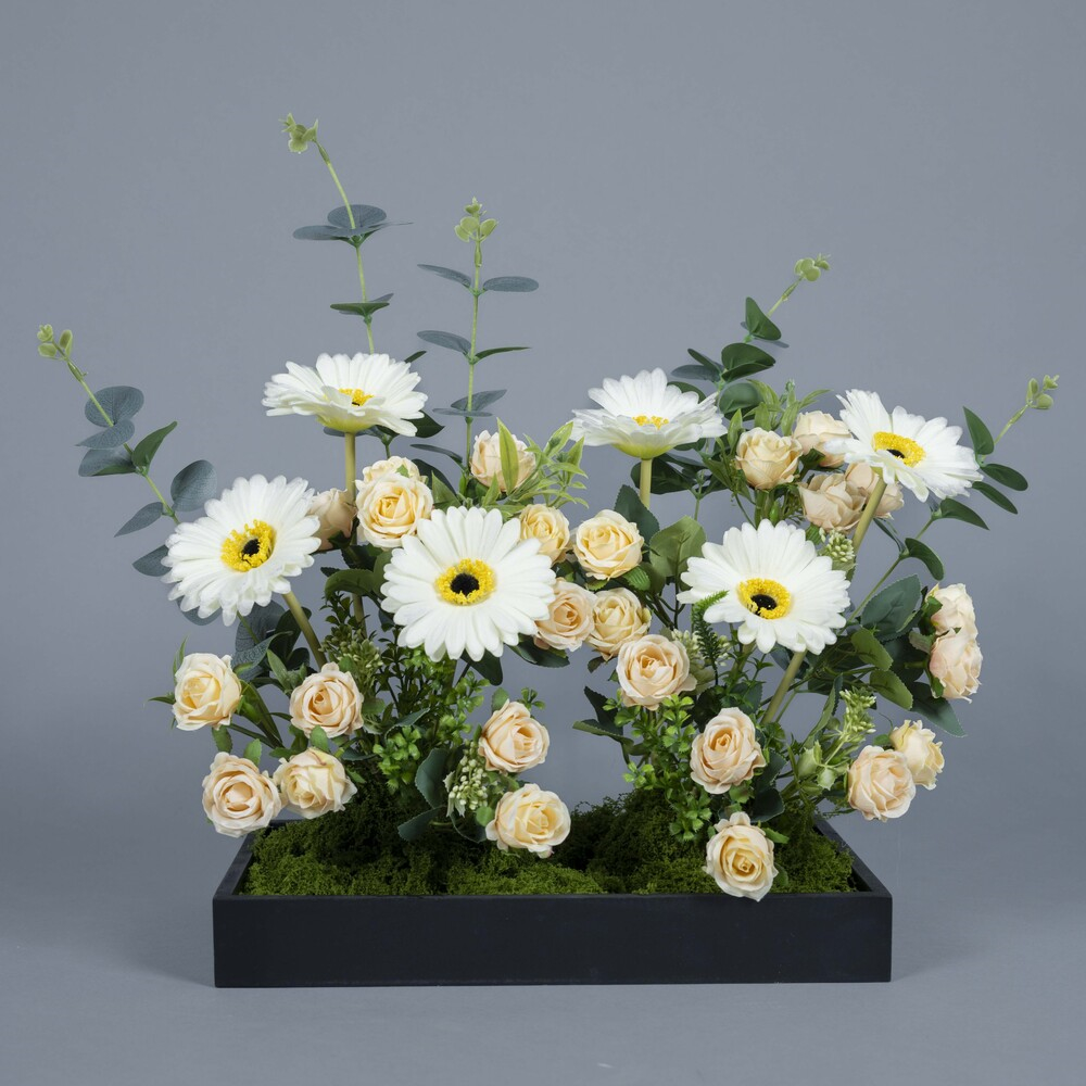 A stylish bouquet featuring artificial flowers, with a modern and elegant touches.