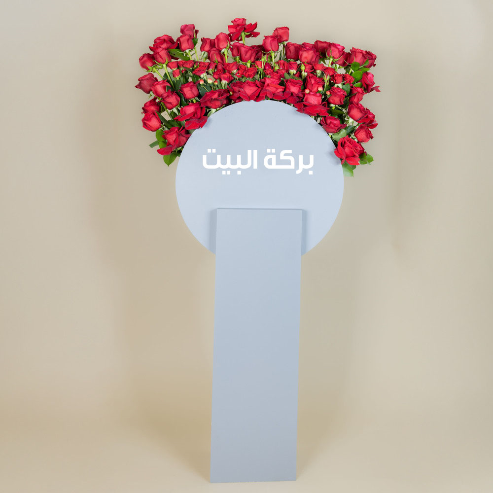 A bouquet containing red roses and baby roses arranged beautifully on a wooden stand.