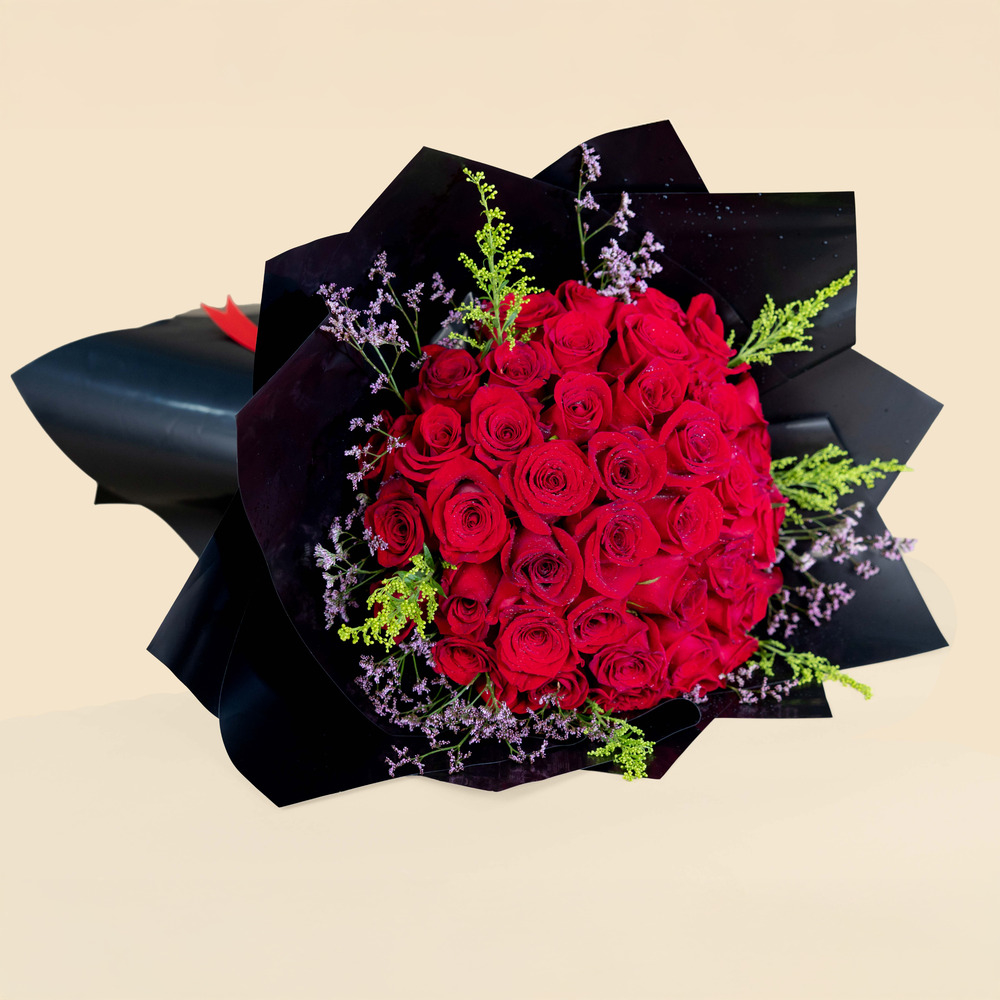 A stunning bouquet of 50 red roses, accented with soft limonium and fresh solidago, wrapped in elegant black for a rich and romantic look.