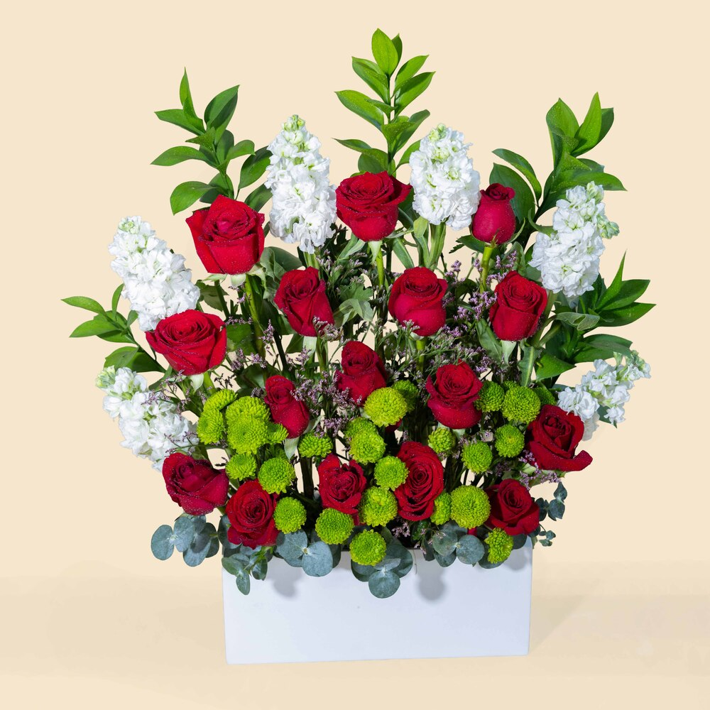 An elegant box featuring roses and mathiola flowers in red.