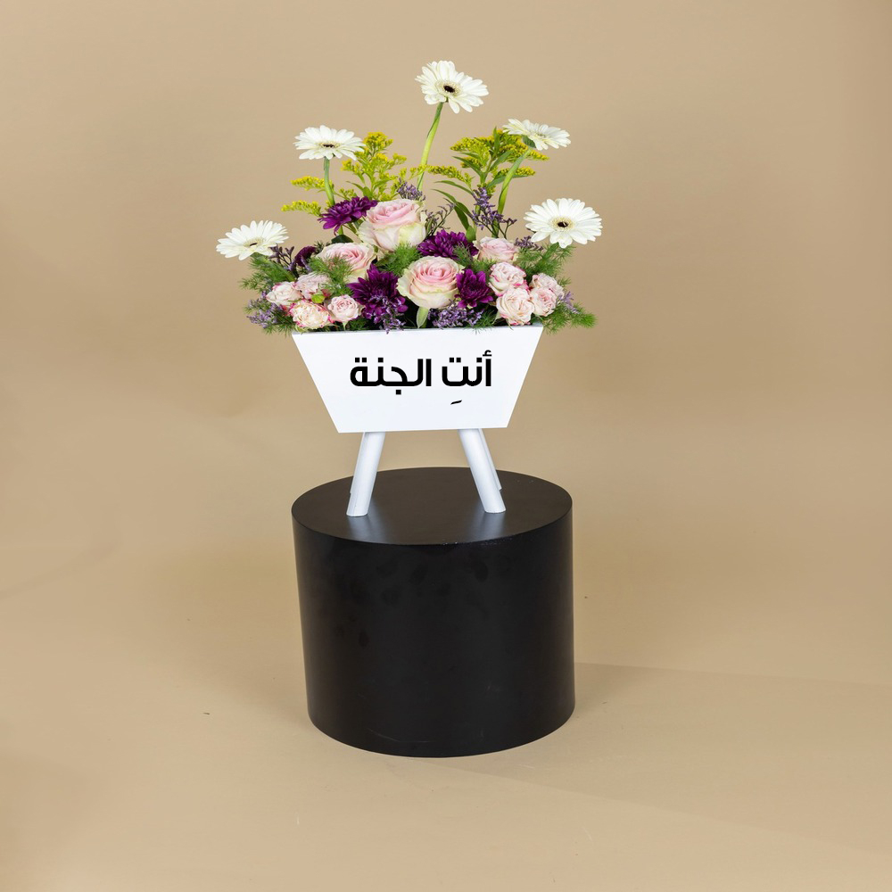 This bouquet contains roses and gerberas. Note: the black base is not included.
