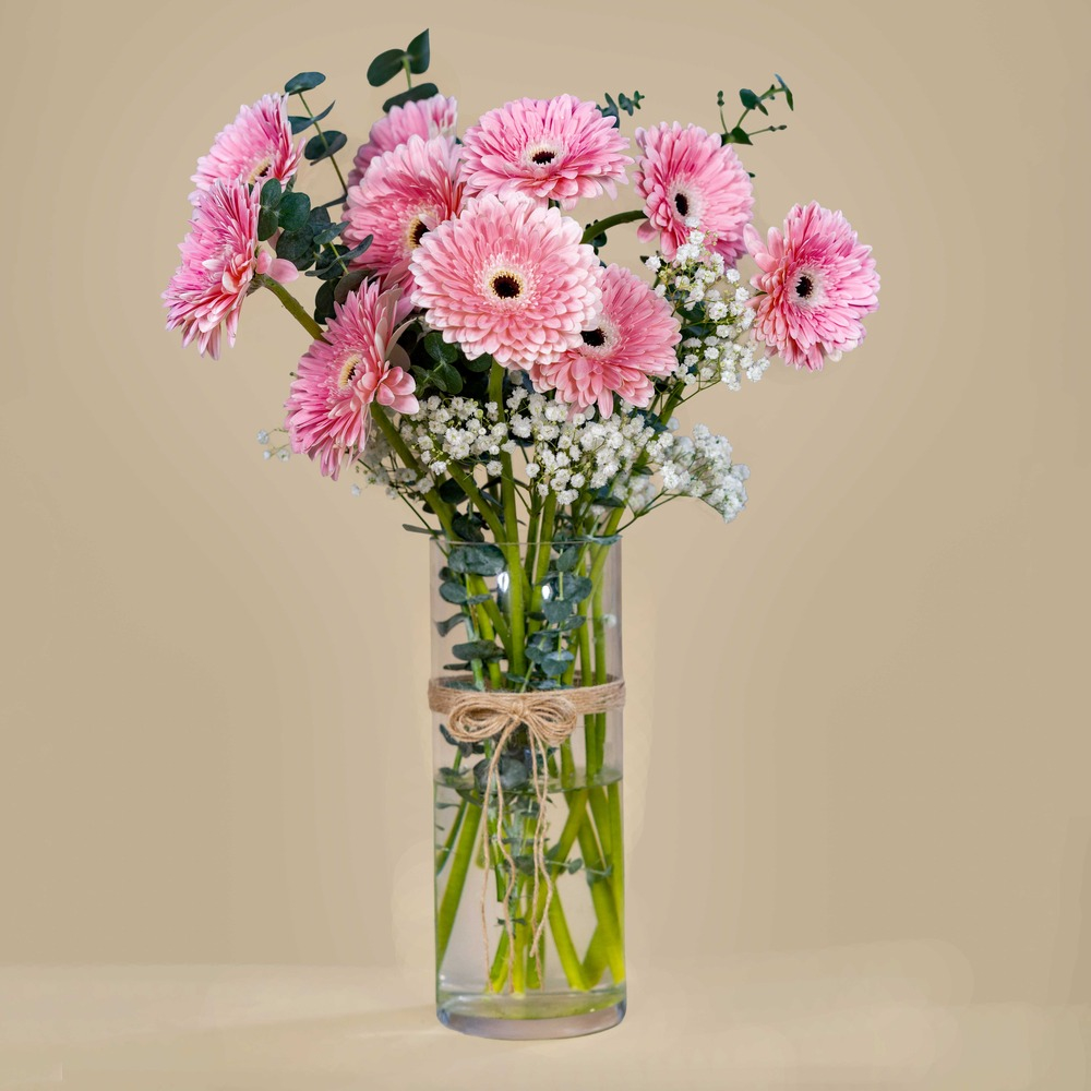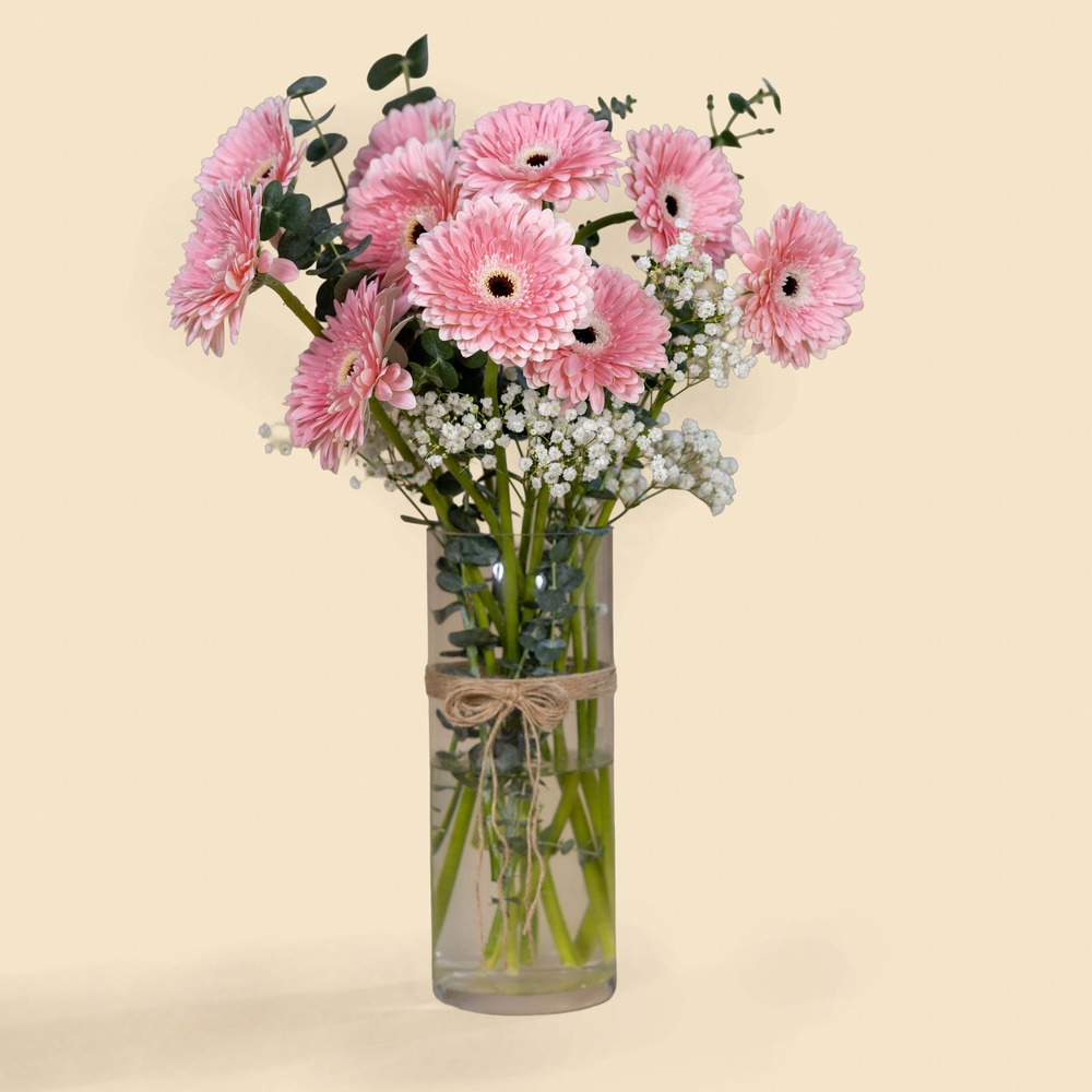 A delicate pink gerbera bouquet with green accents and white gypsophila, presented in an elegant glass cylinder for a fresh and serene look.