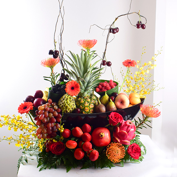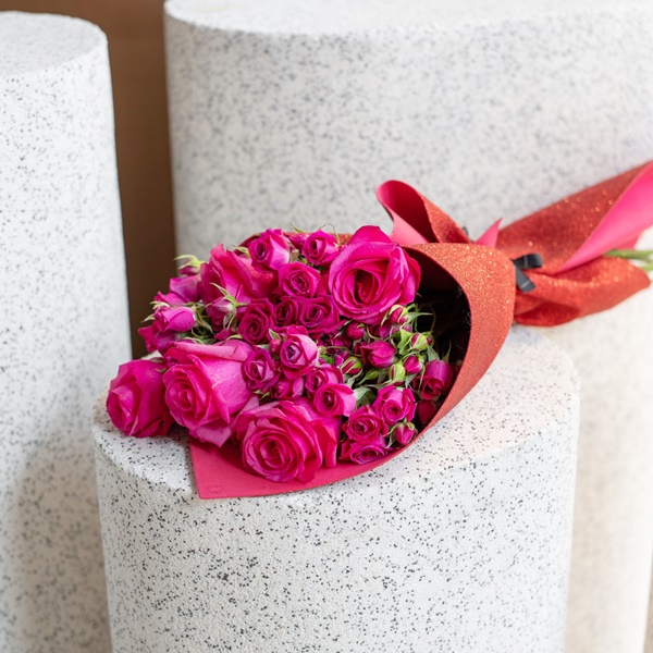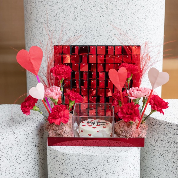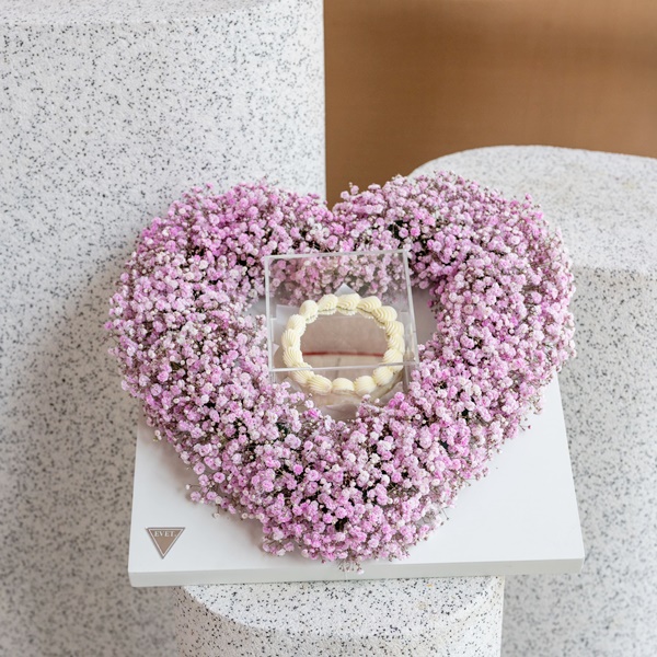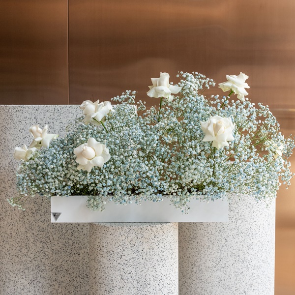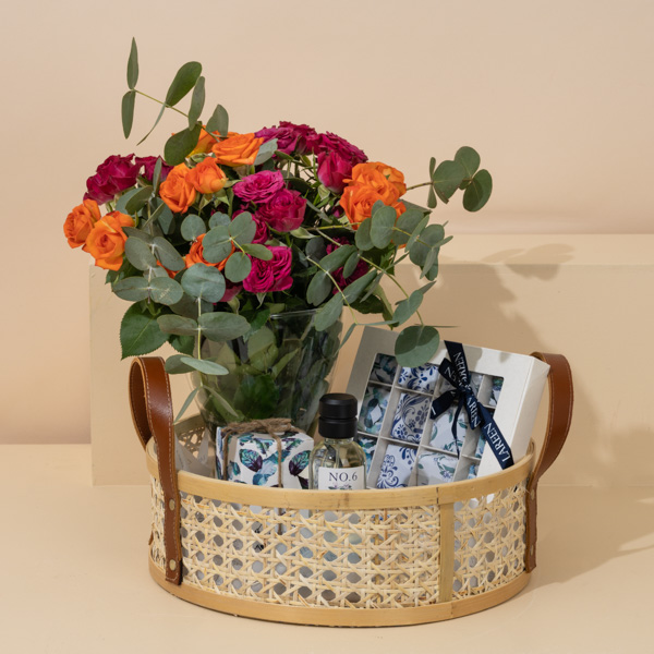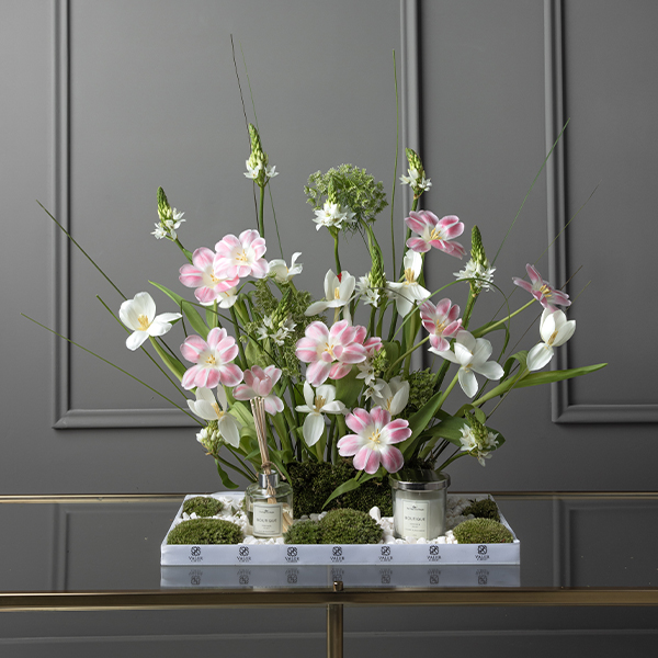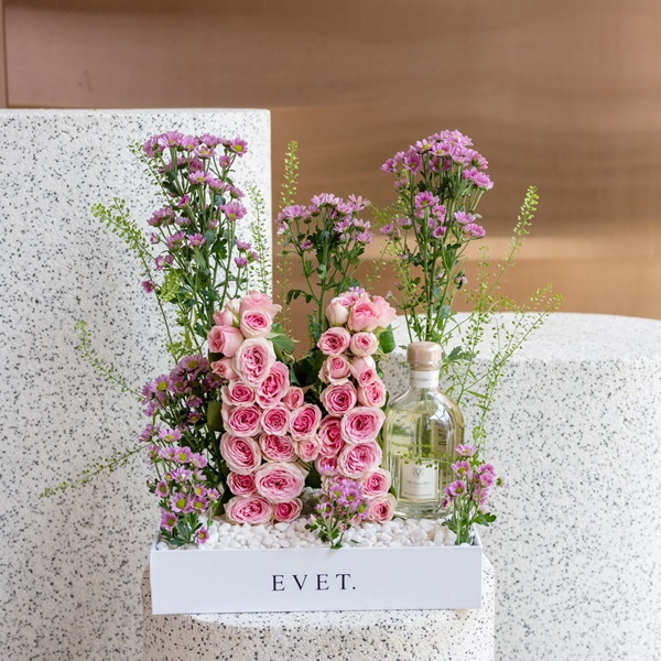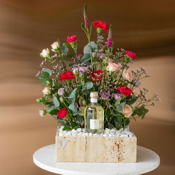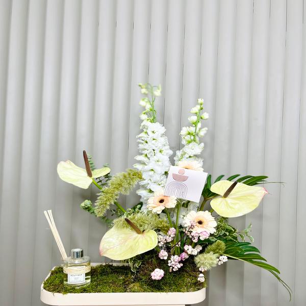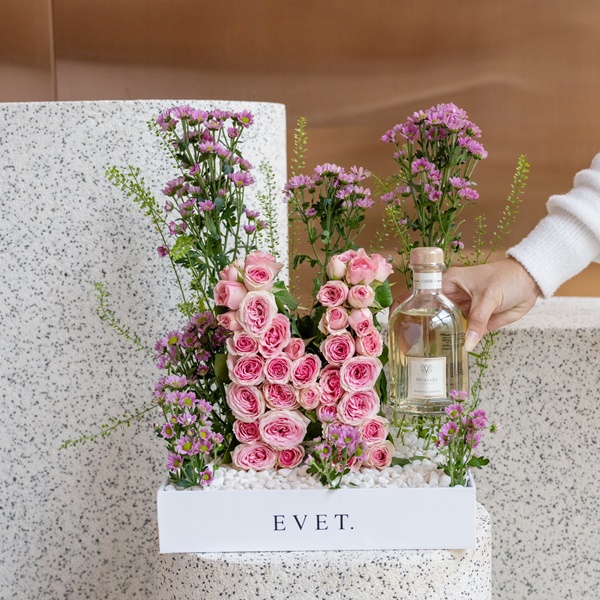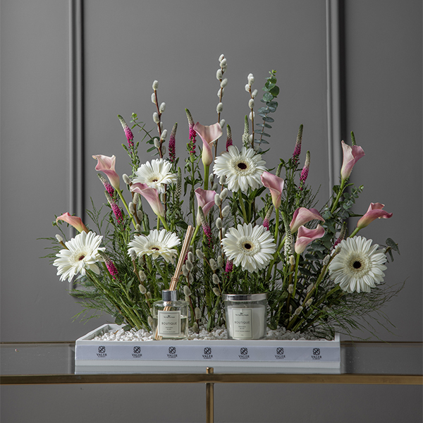 A letter baby roses arrangement with dr vranjes 250 ml diffuser in a white tray.