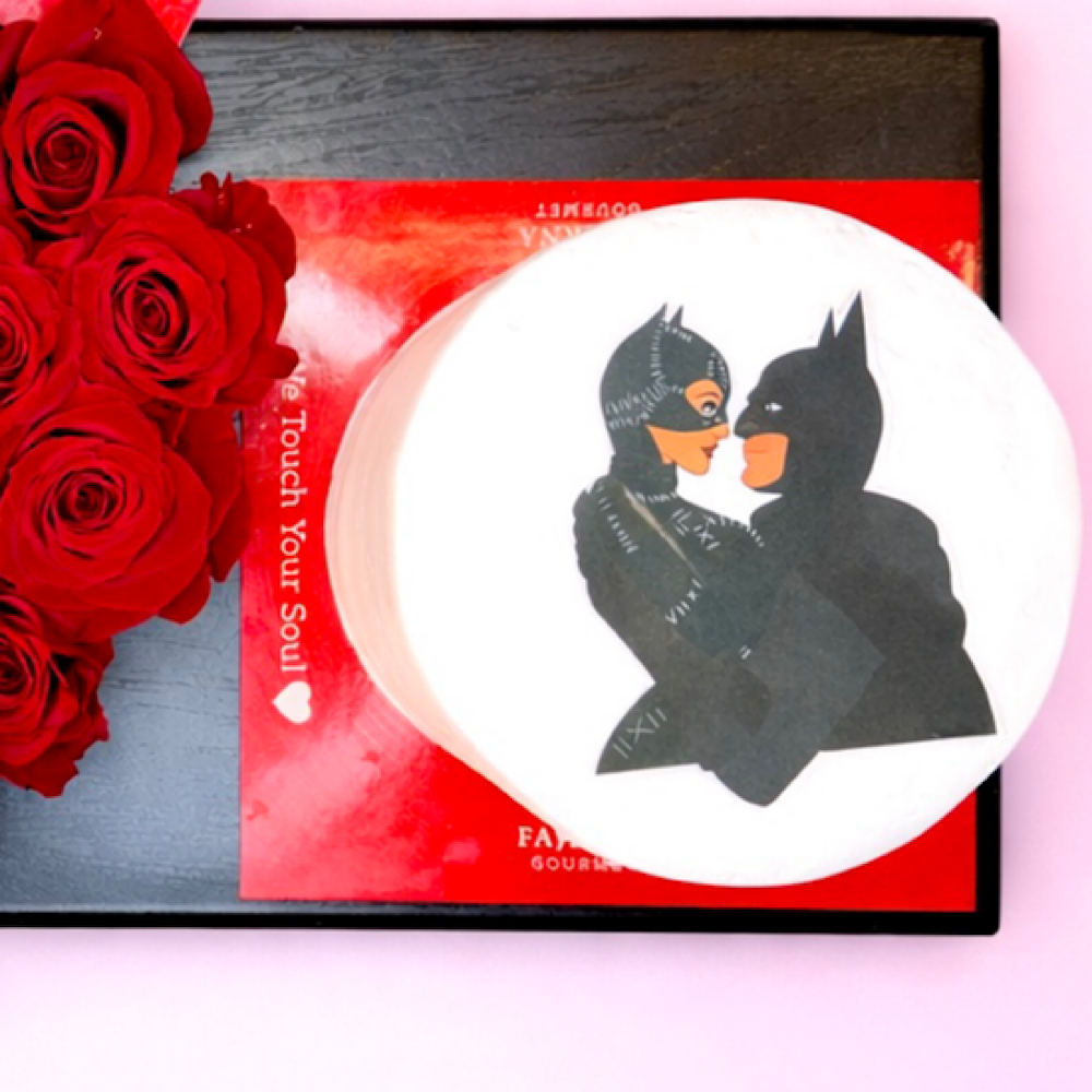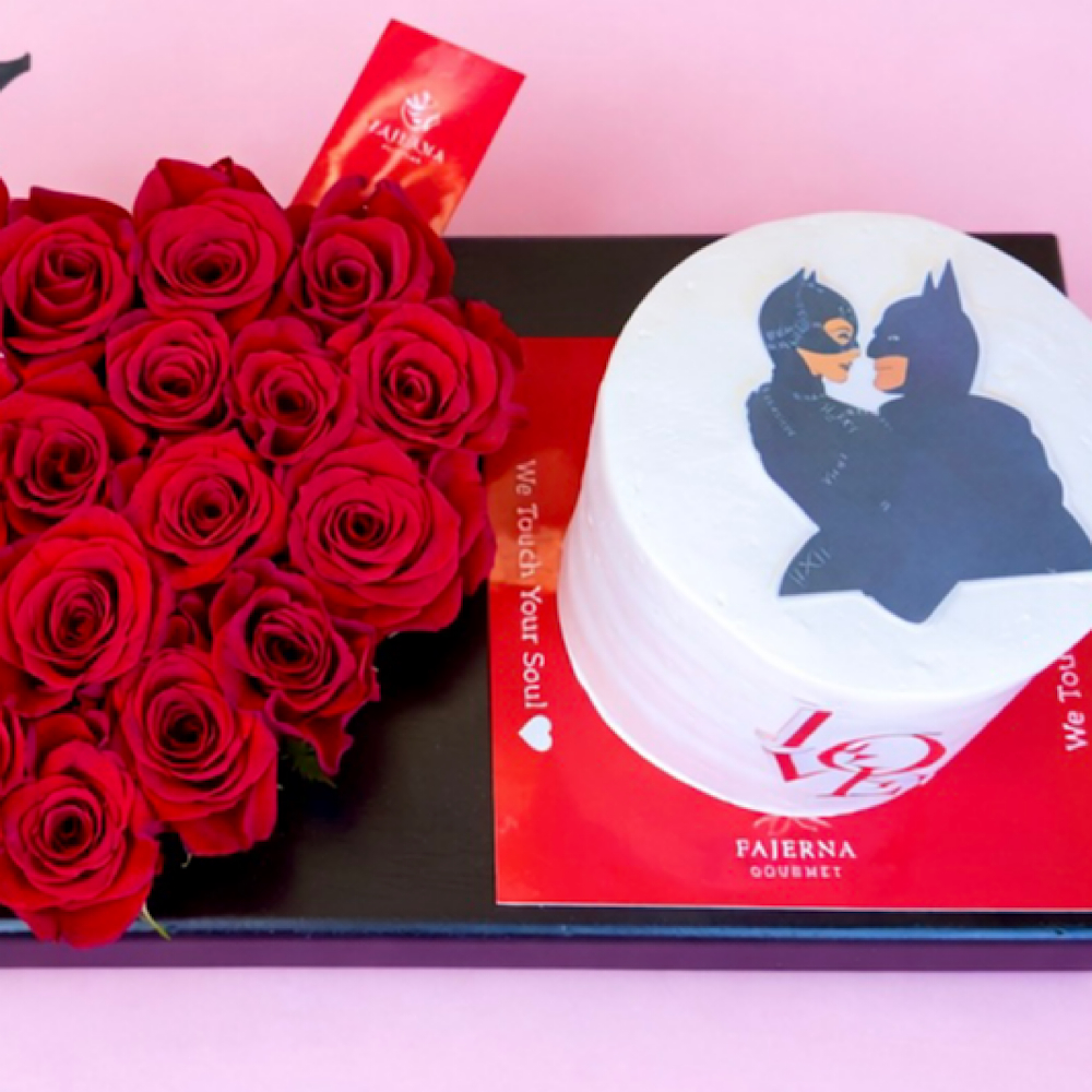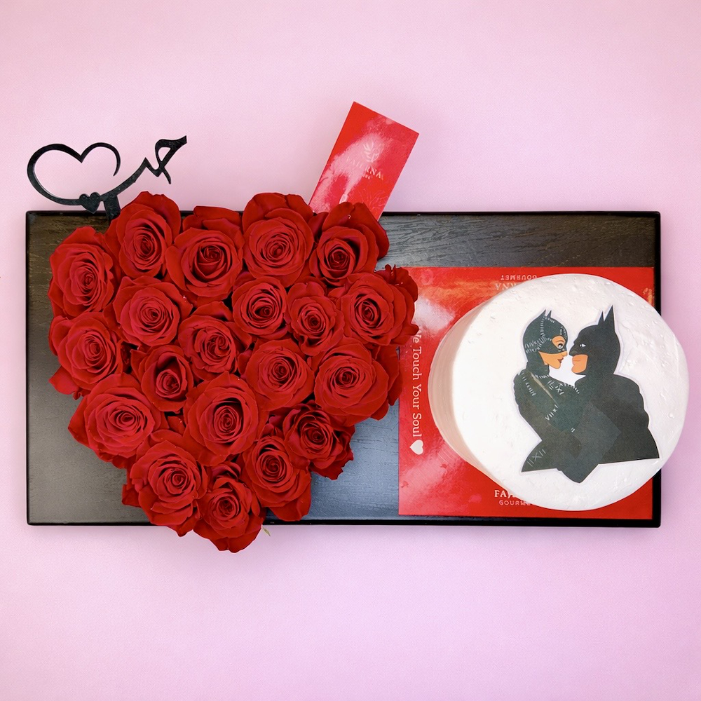 A bouquet containing red roses, arranged beautifully in a tray. Comes with a cake.