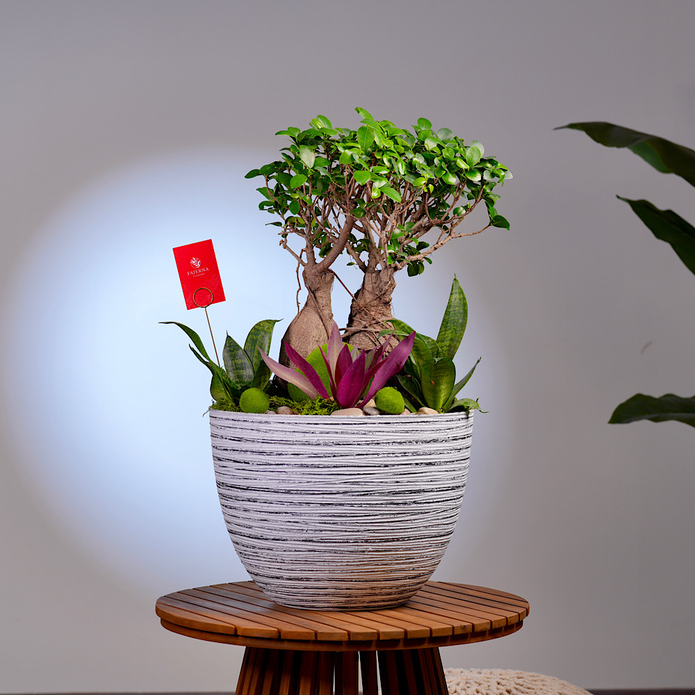 A unique large bonsai tree arranged with neoregelia and sansevieria plants in a special design.