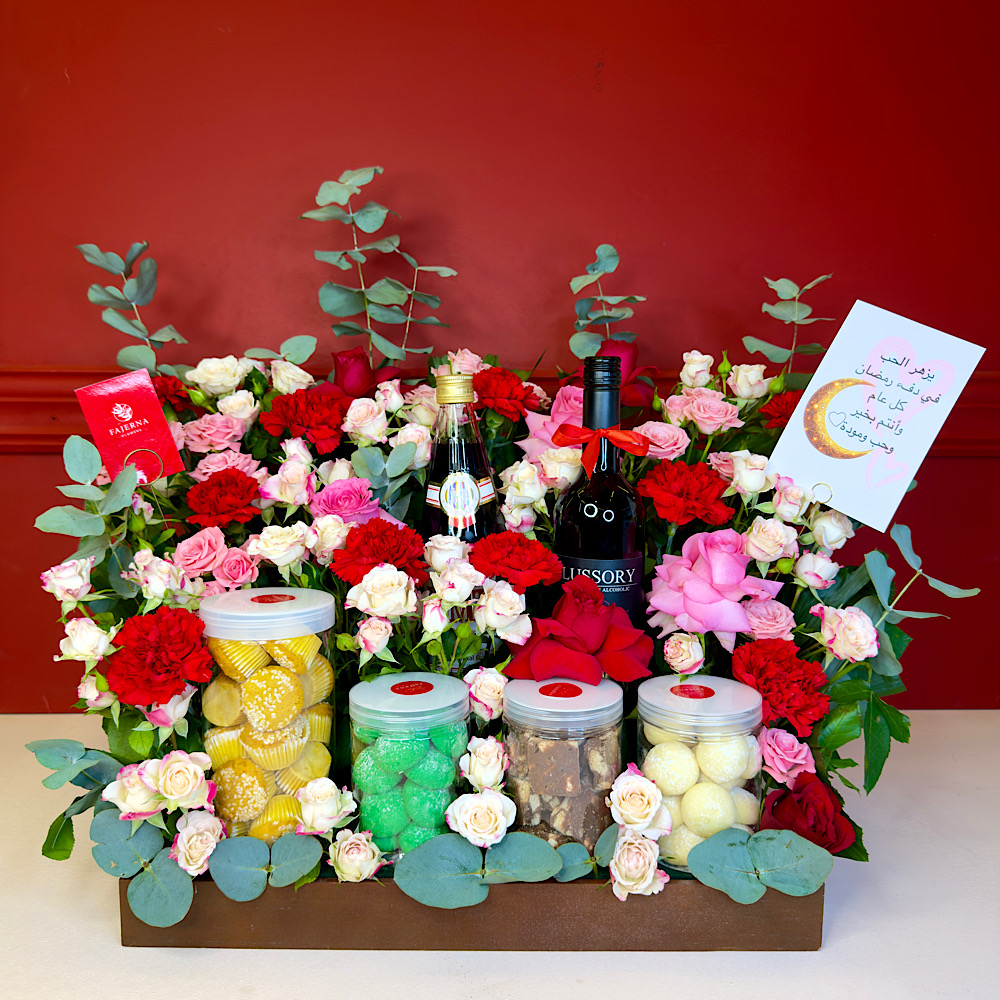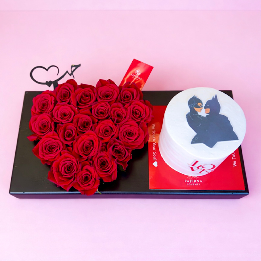 A unique bouquet arranged with red roses and anthurium with red balloons in a special way with a box of Belgian chocolates.