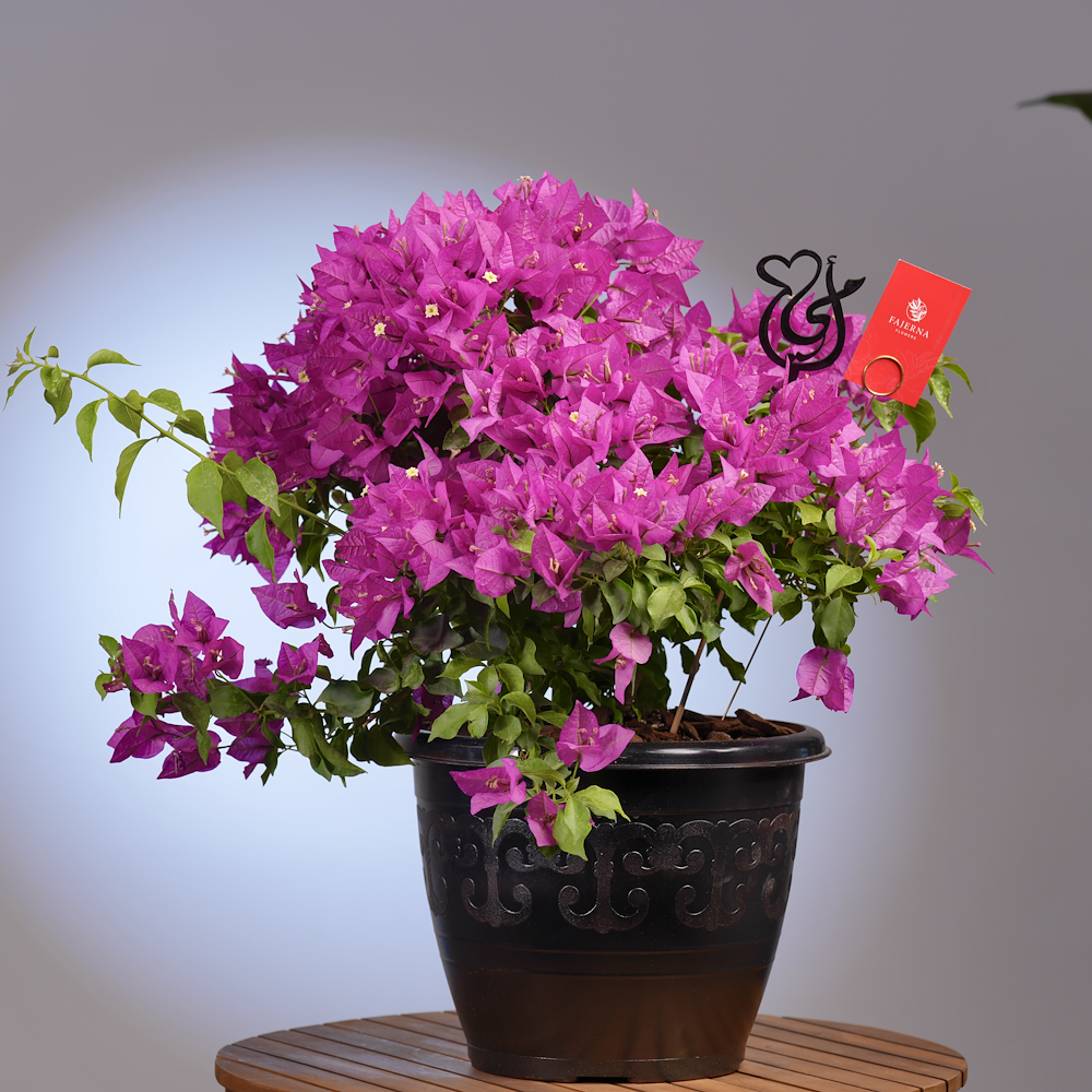 A natural pink bougainvillea plant with soft white foliage adds an elegant, fresh touch to any space as a long-lasting gift. Suitable for bright indoor areas or outdoor use. Easy care and requires bright light.