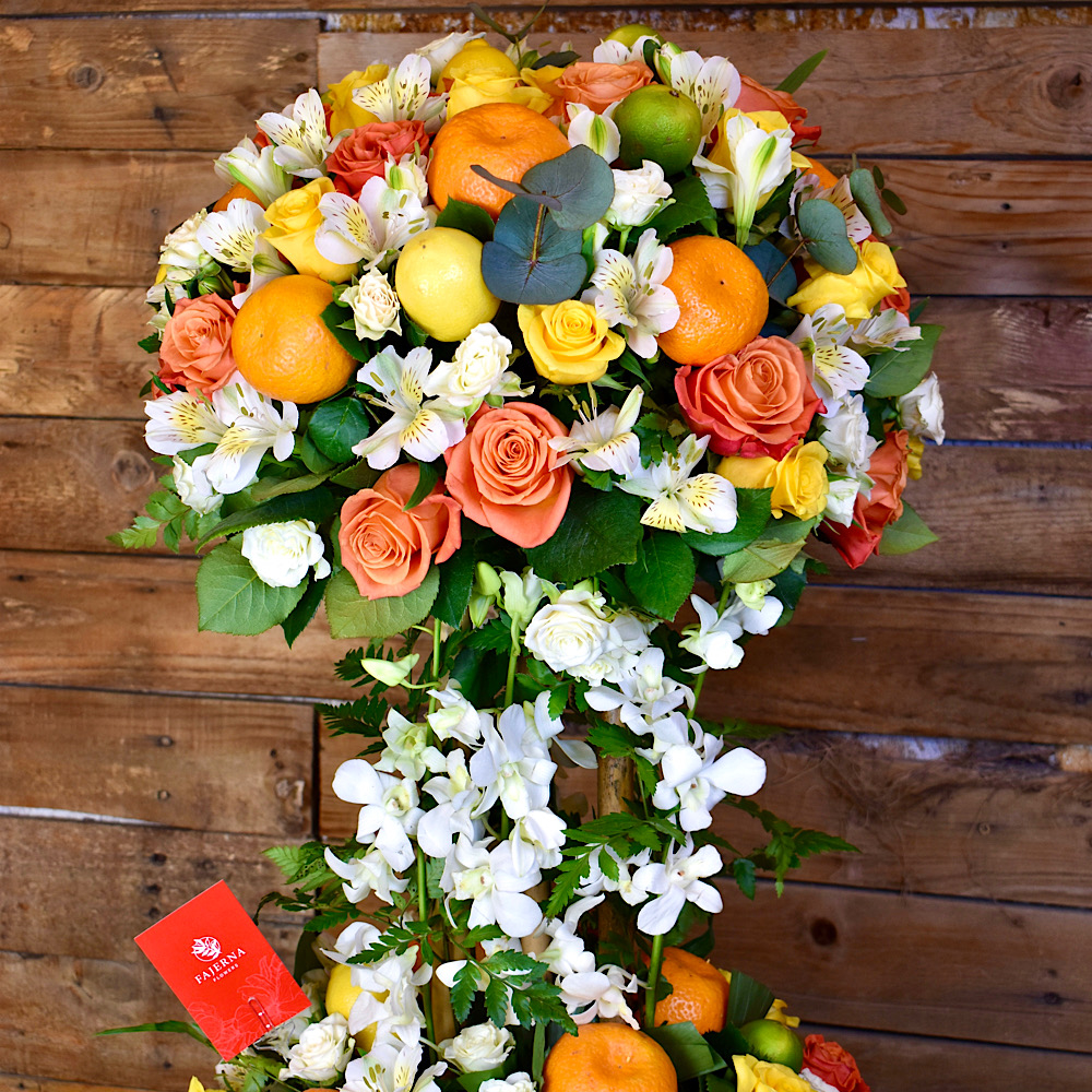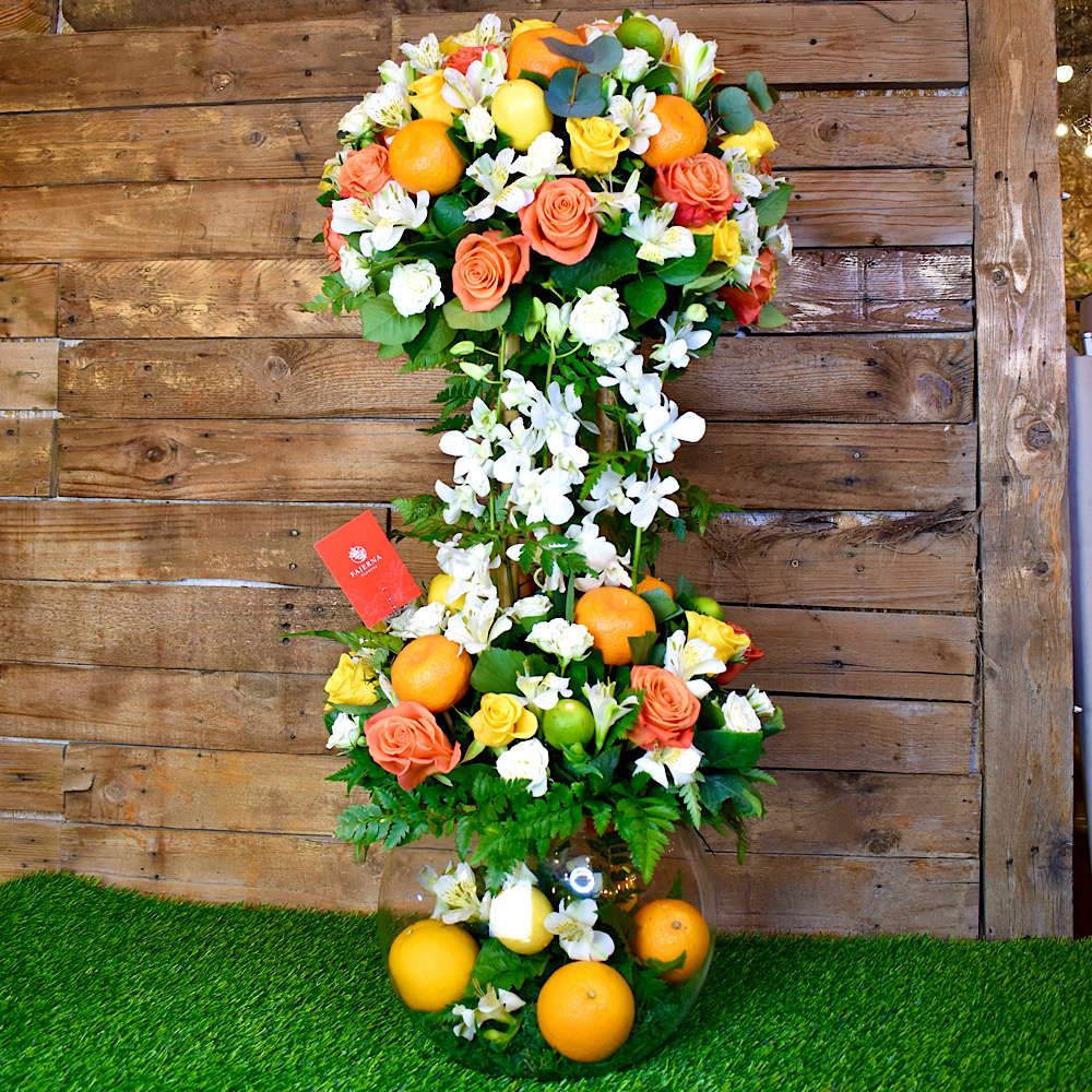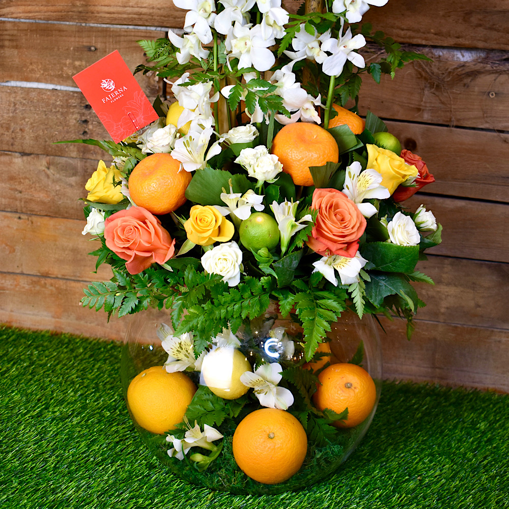 A vase filled with a tree of fruits, roses, baby roses, orchids and alstroemerias.
