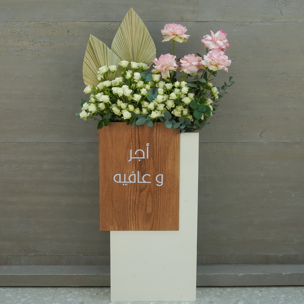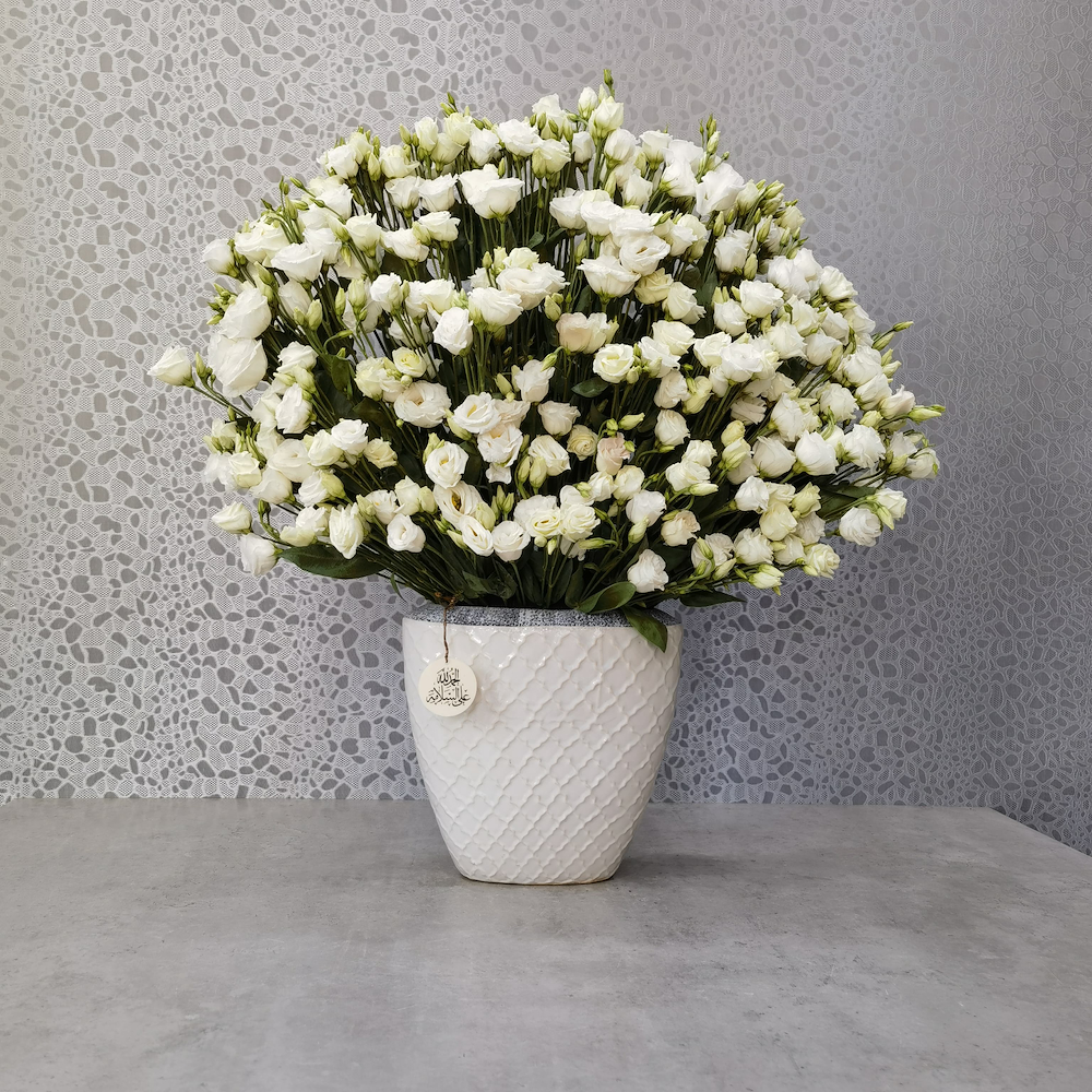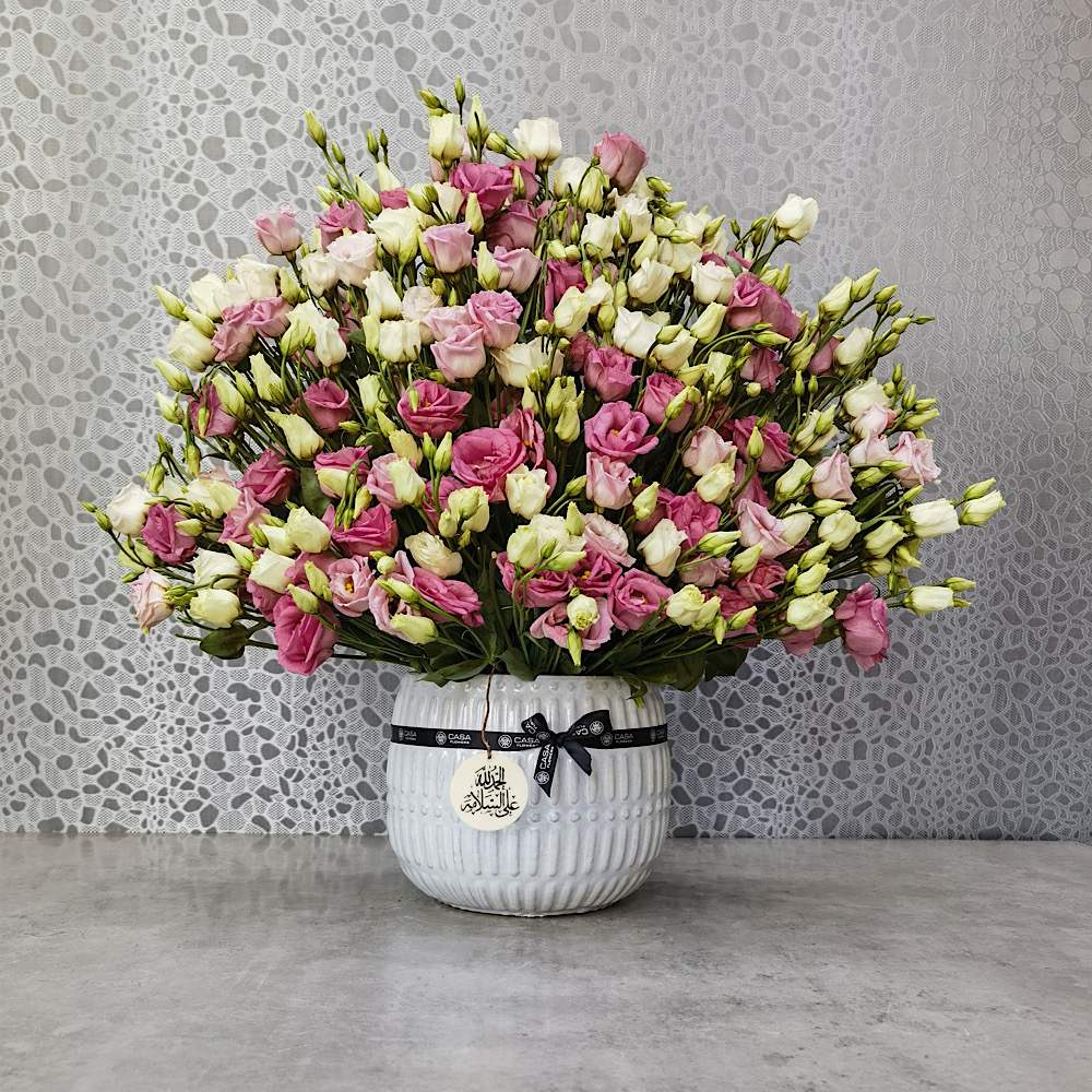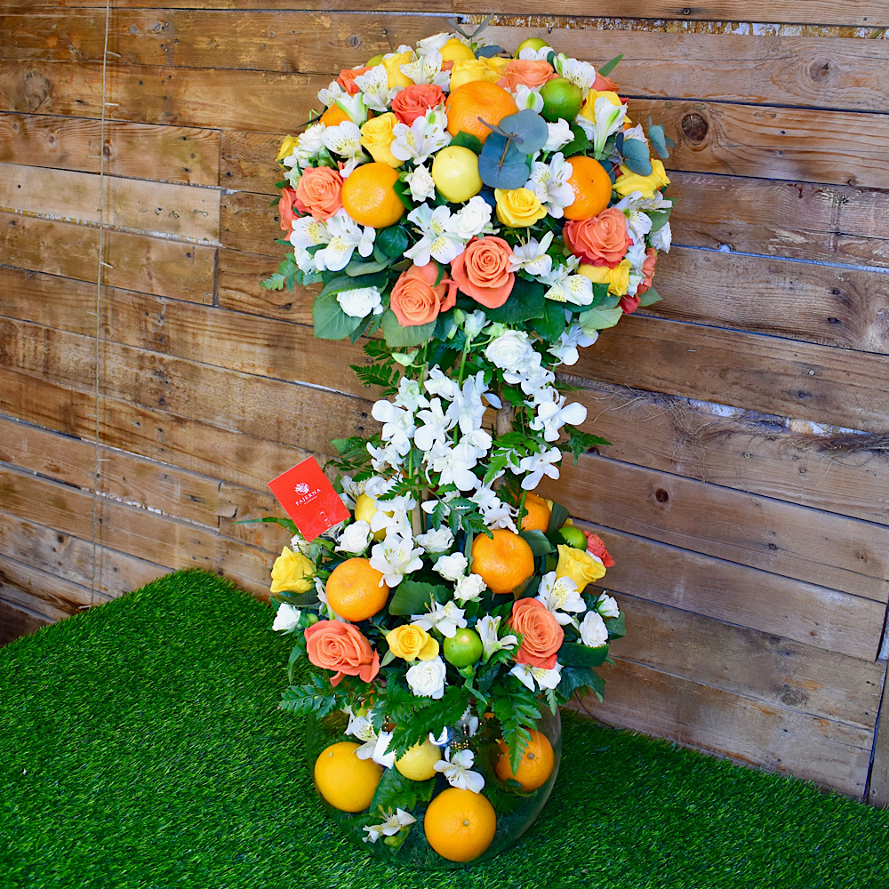 A vase filled with a tree of fruits, roses, baby roses, orchids and alstroemerias.