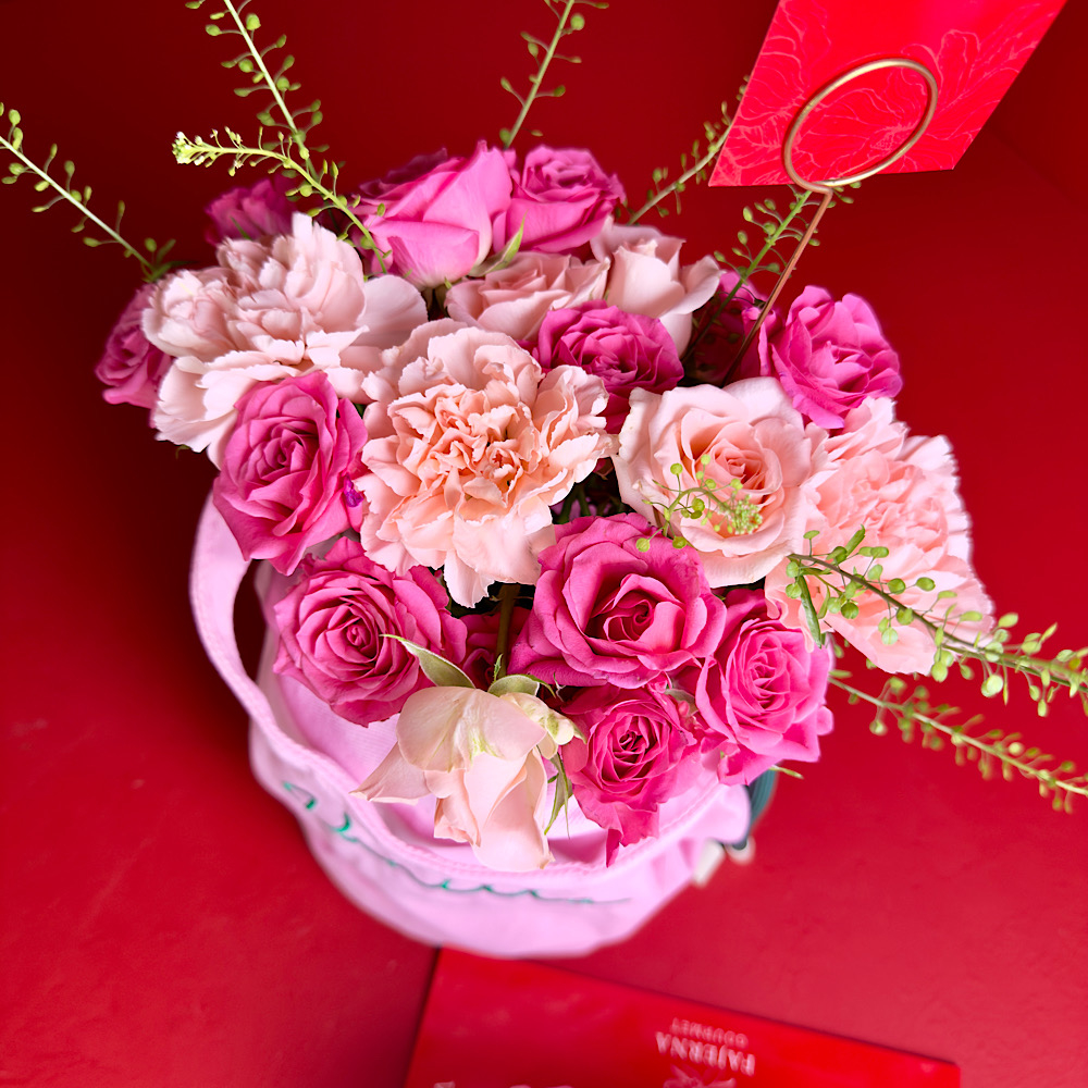 A bouquet containing pink roses and carnations, arranged beautifully in a trendy Korean bag, and comes with a birthday cake