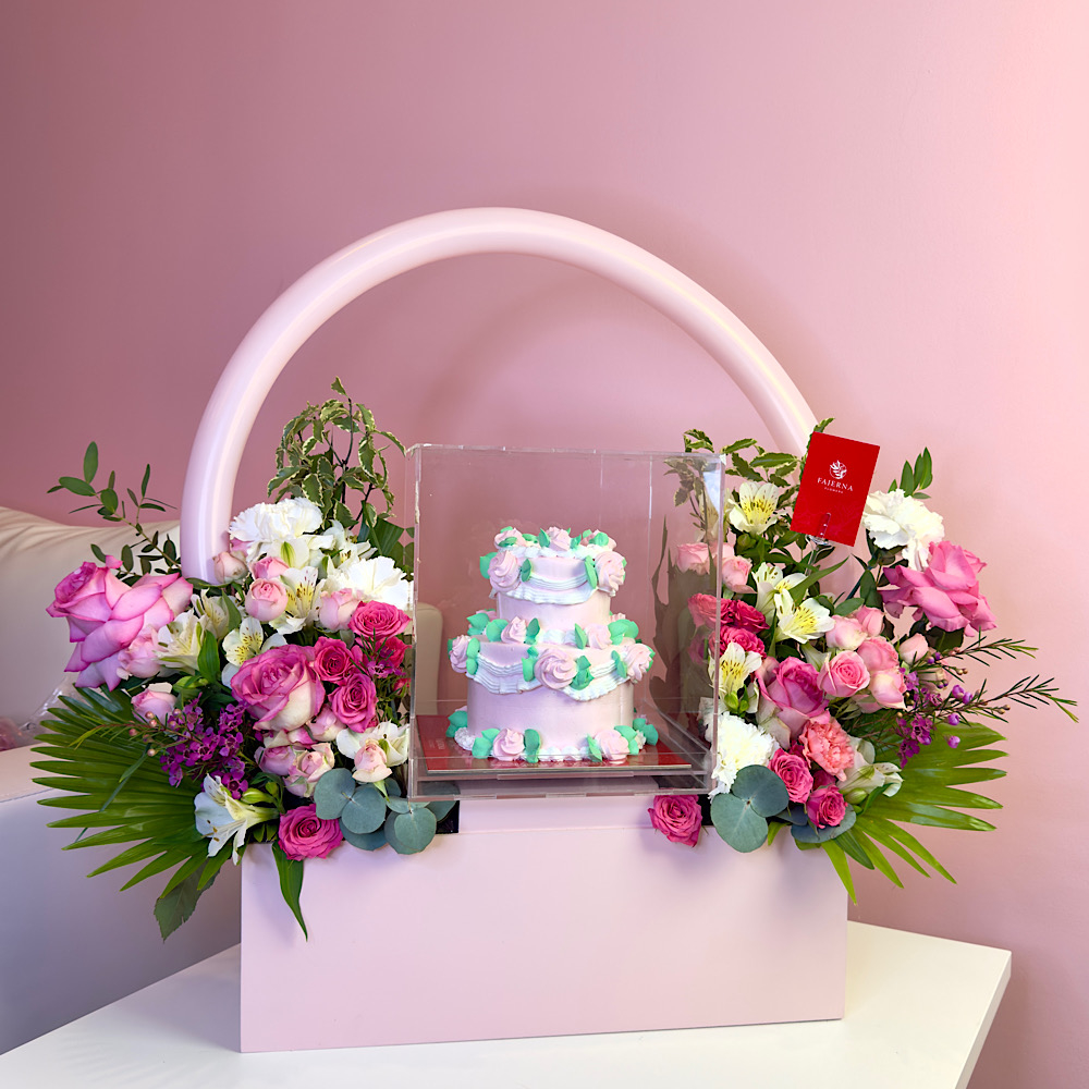 Bouquet of gerbera flowers and alstroemerias arranged with fruits in black stand.