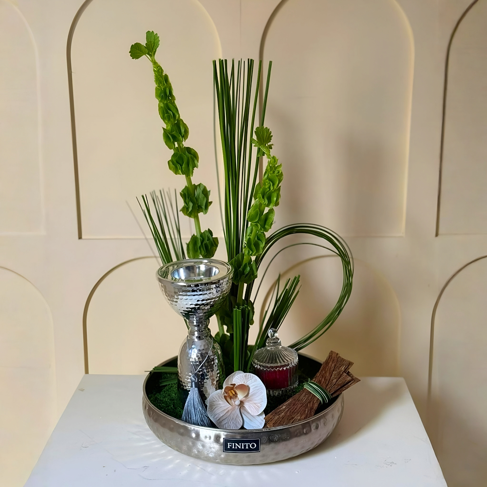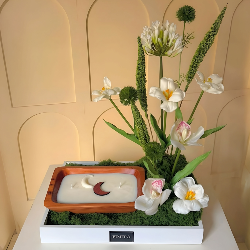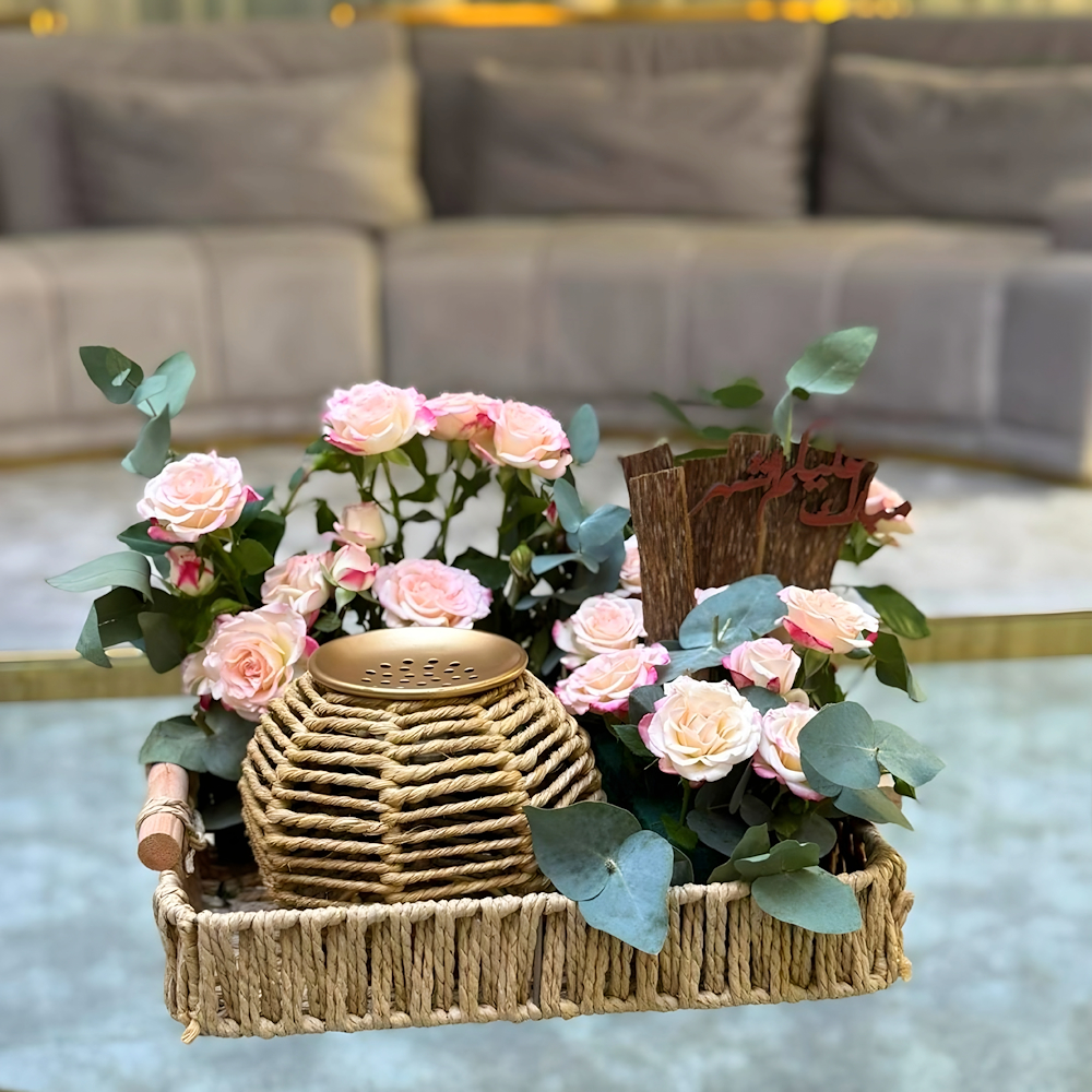 A stand that contains rose and carnation flowers with a candle and bisht.
