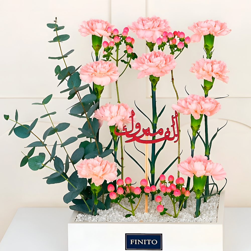 A bouquet containing pink carnation flowers and eucalyptus leaves arranged beautifully in a box.