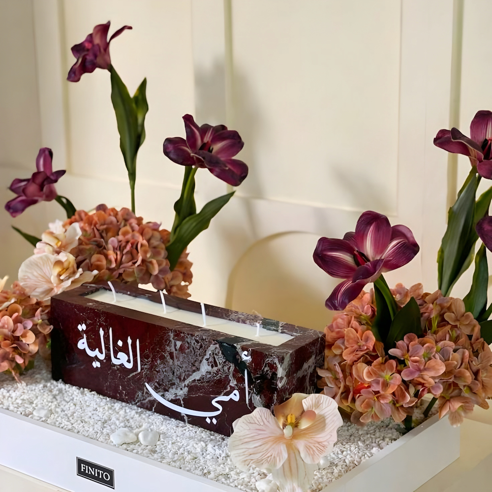 A tray containing tulips, hydrangeas, and orchids, arranged beautifully. Comes with a candle.