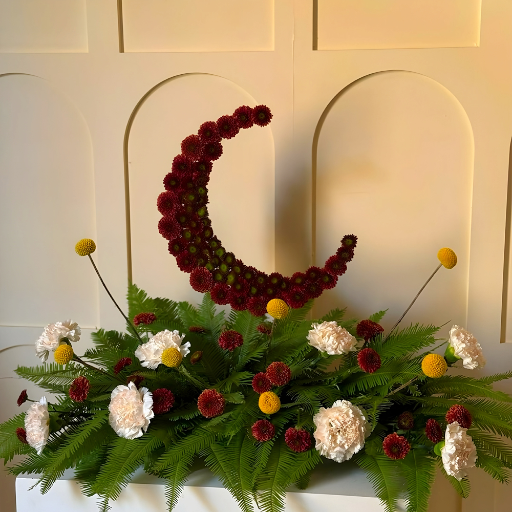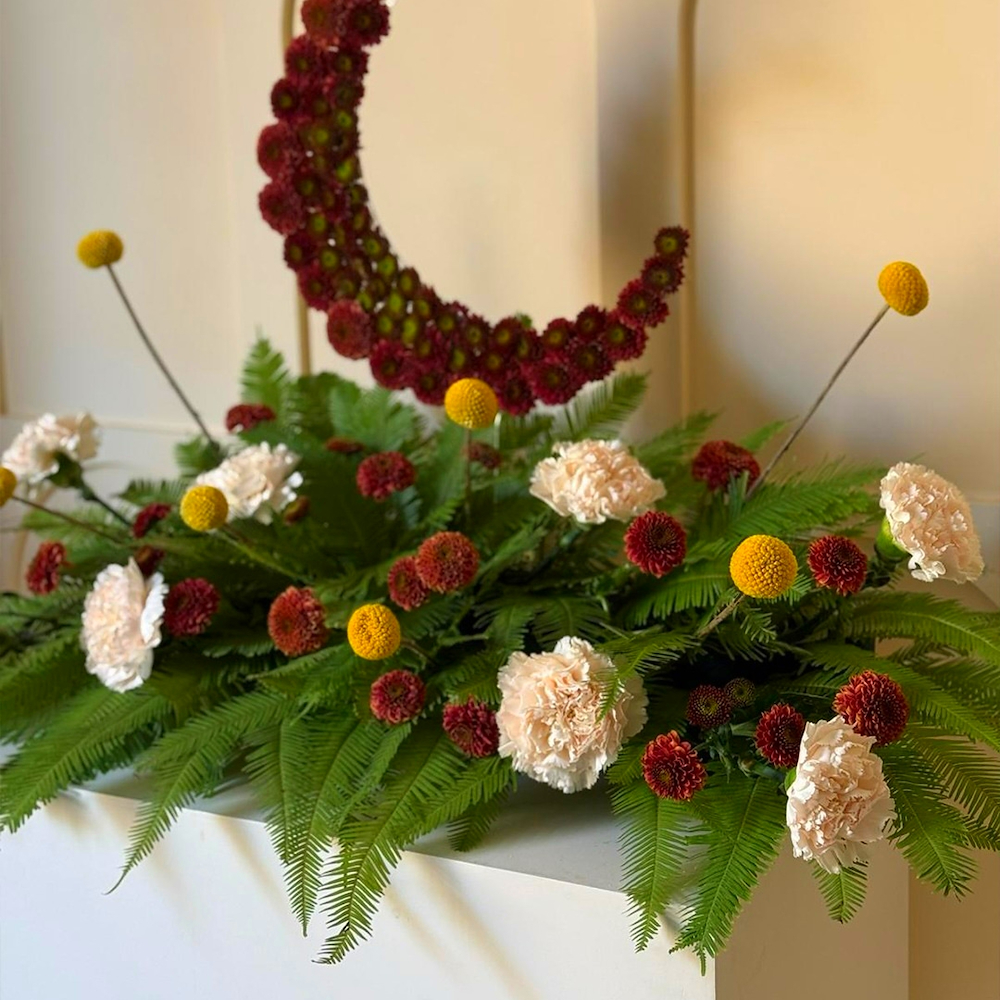 A bouquet containing craspedia, chrysanthemums, and carnations, arranged beautifully in a tray.