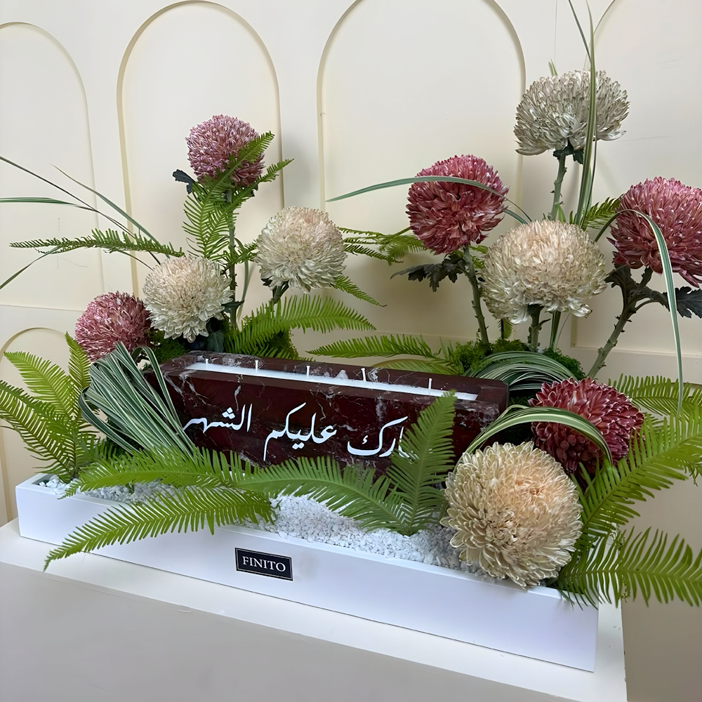 A tray containing chrysanthemum pong flowers, paired with an elegant marble candle. A simple yet refined arrangement, perfect for adding a calm and stylish touch to your Ramadan gatherings.