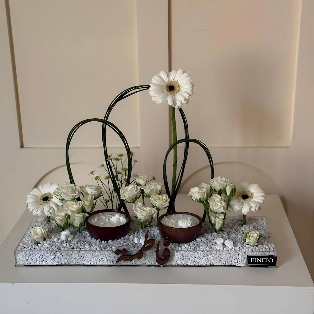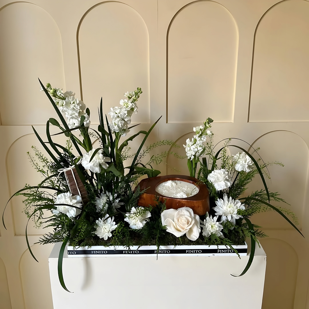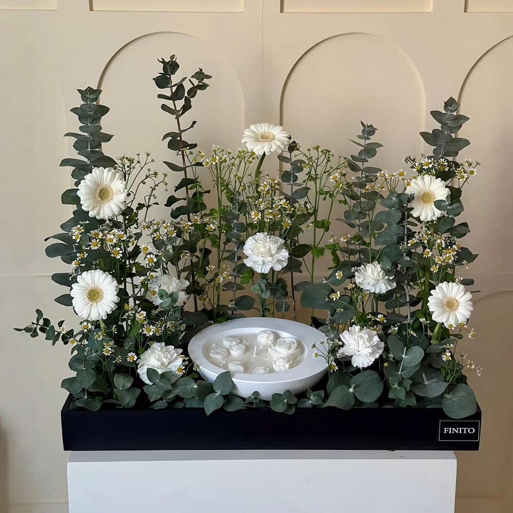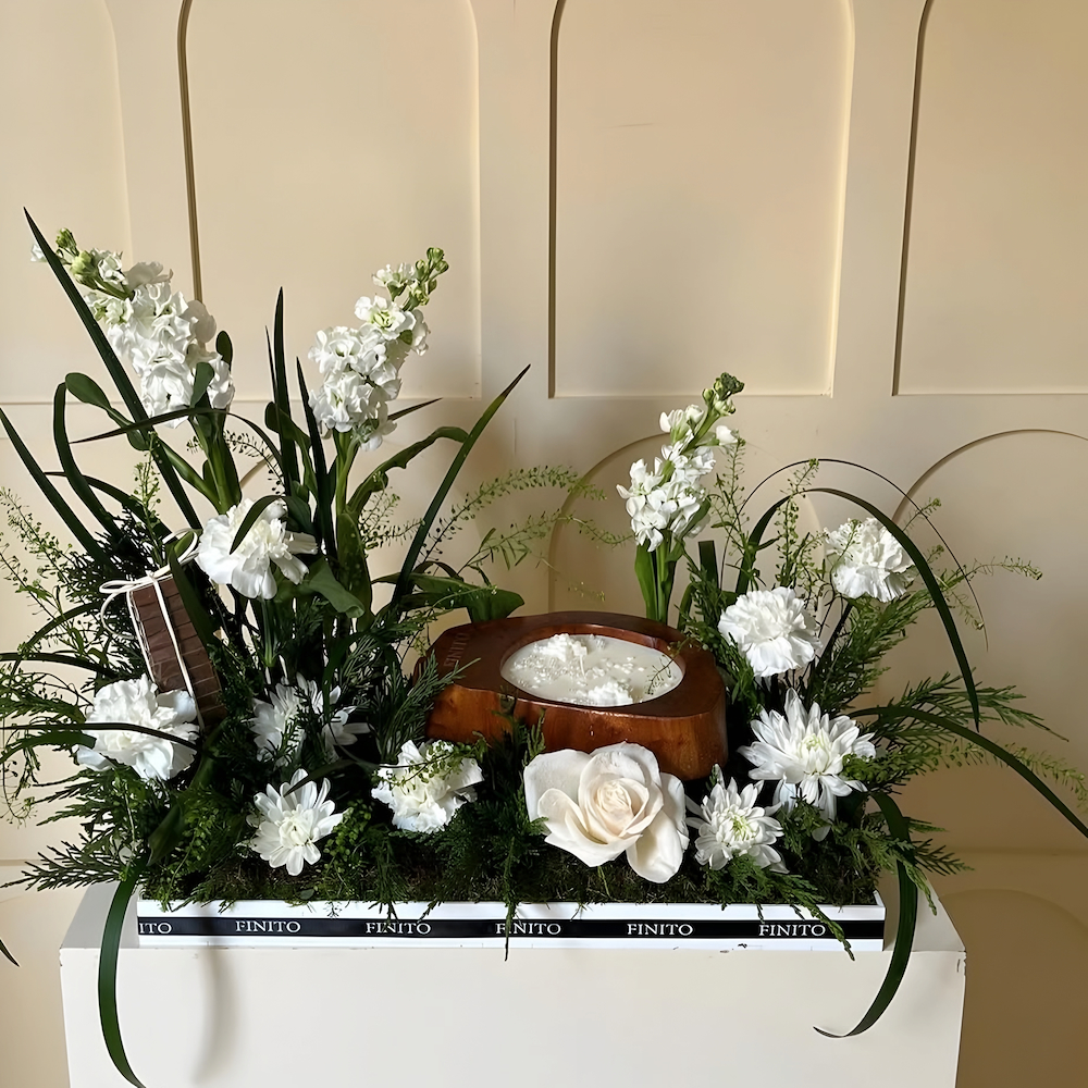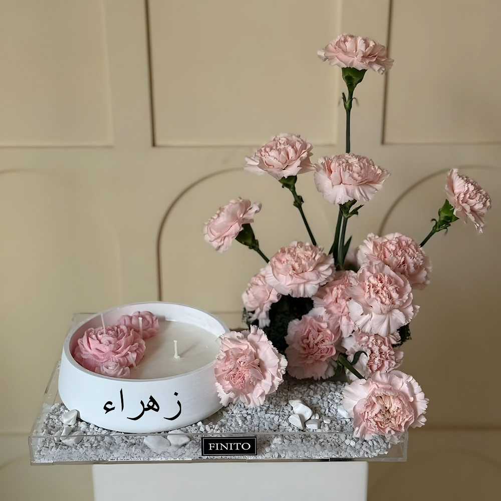 A bouquet containing roses, gerberas, delphiniums, and carnations, arranged beautifully in a tray. Comes with a candle.