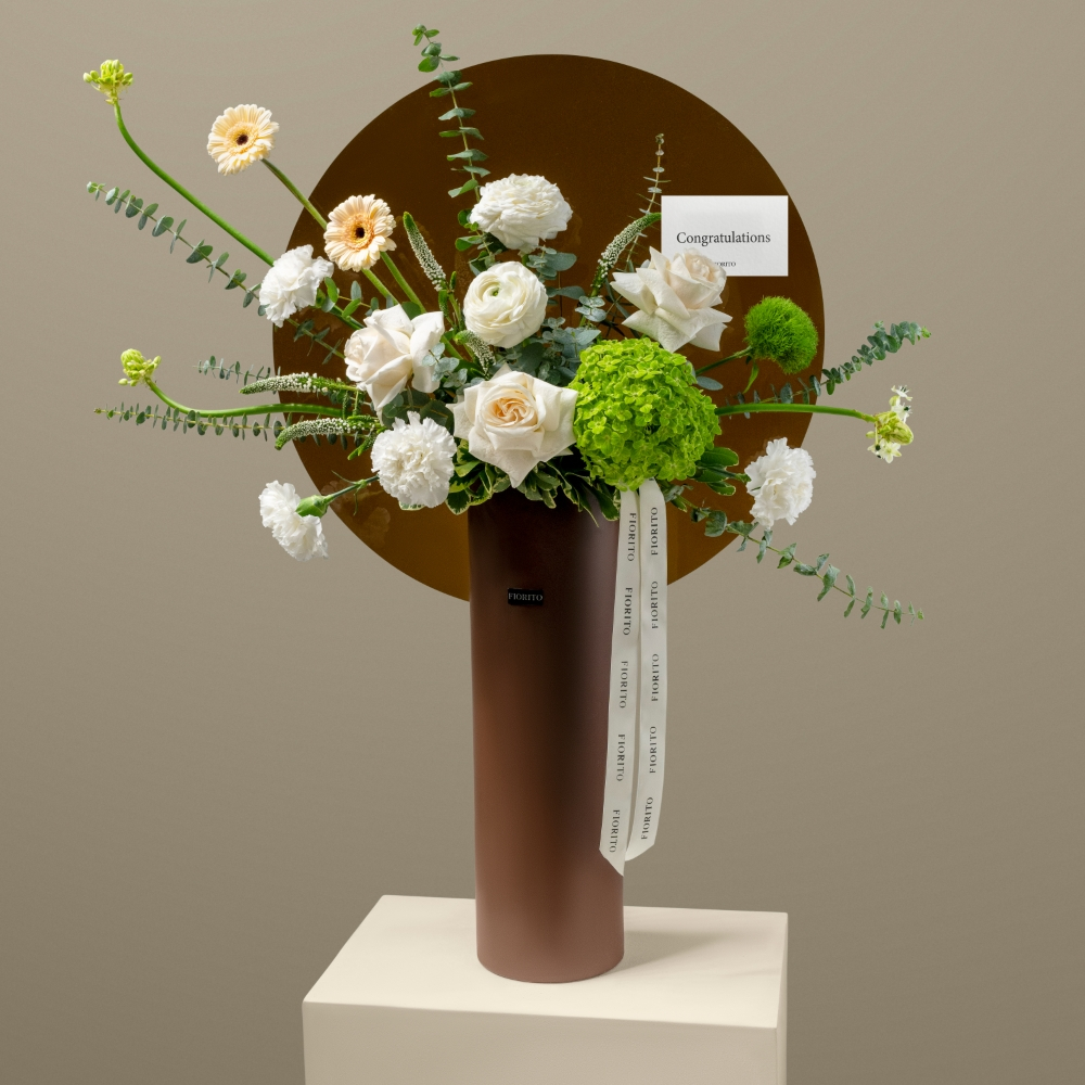An elegant vase featuring hydrangeas, veronica, carnations, and gerberas, complemented by delicate floral lush greenery, a graceful arrangement perfect for refined spaces.
