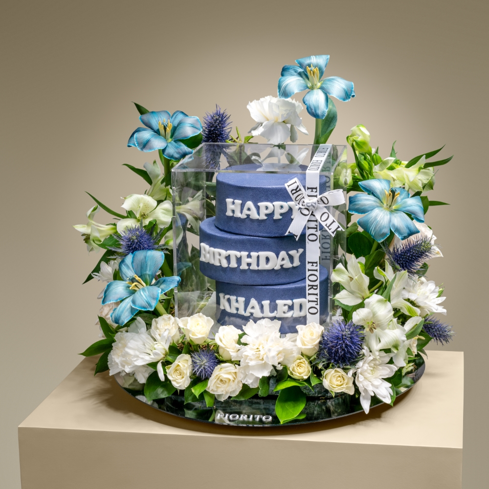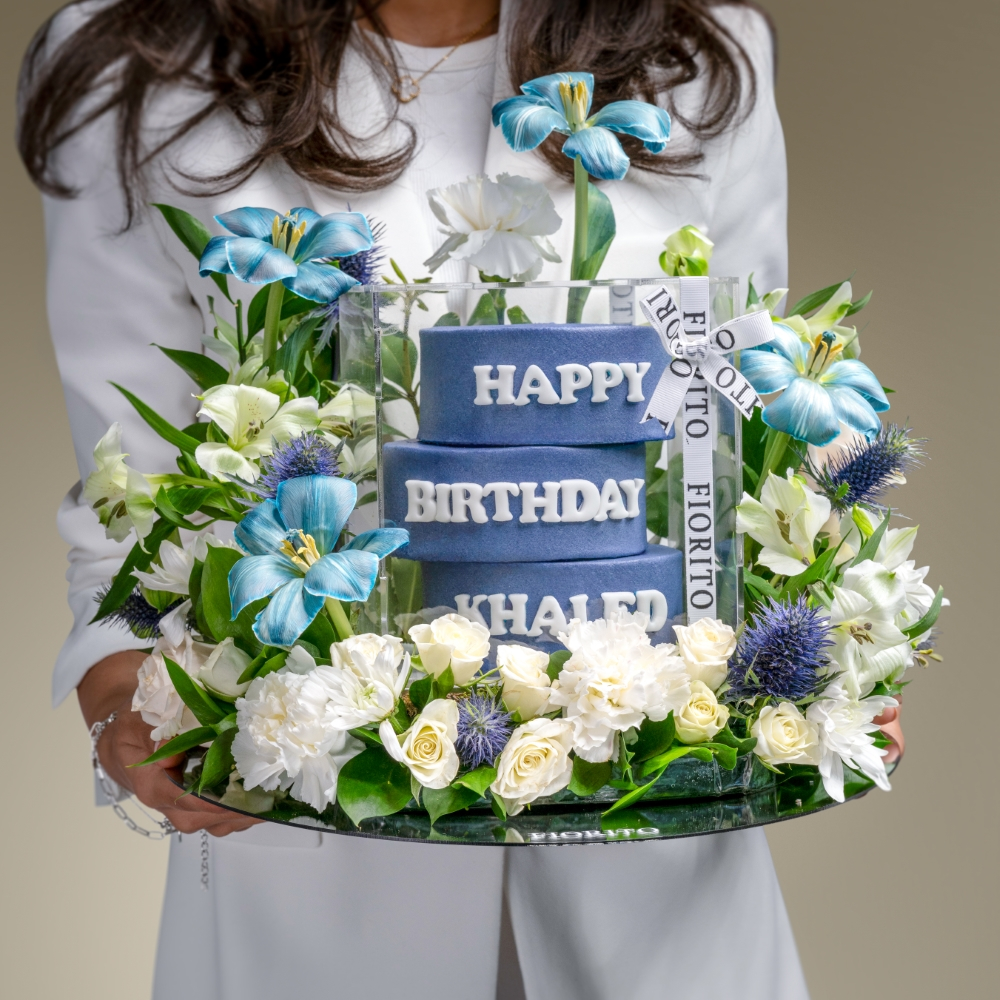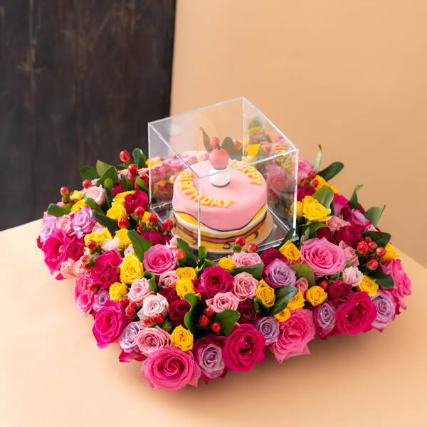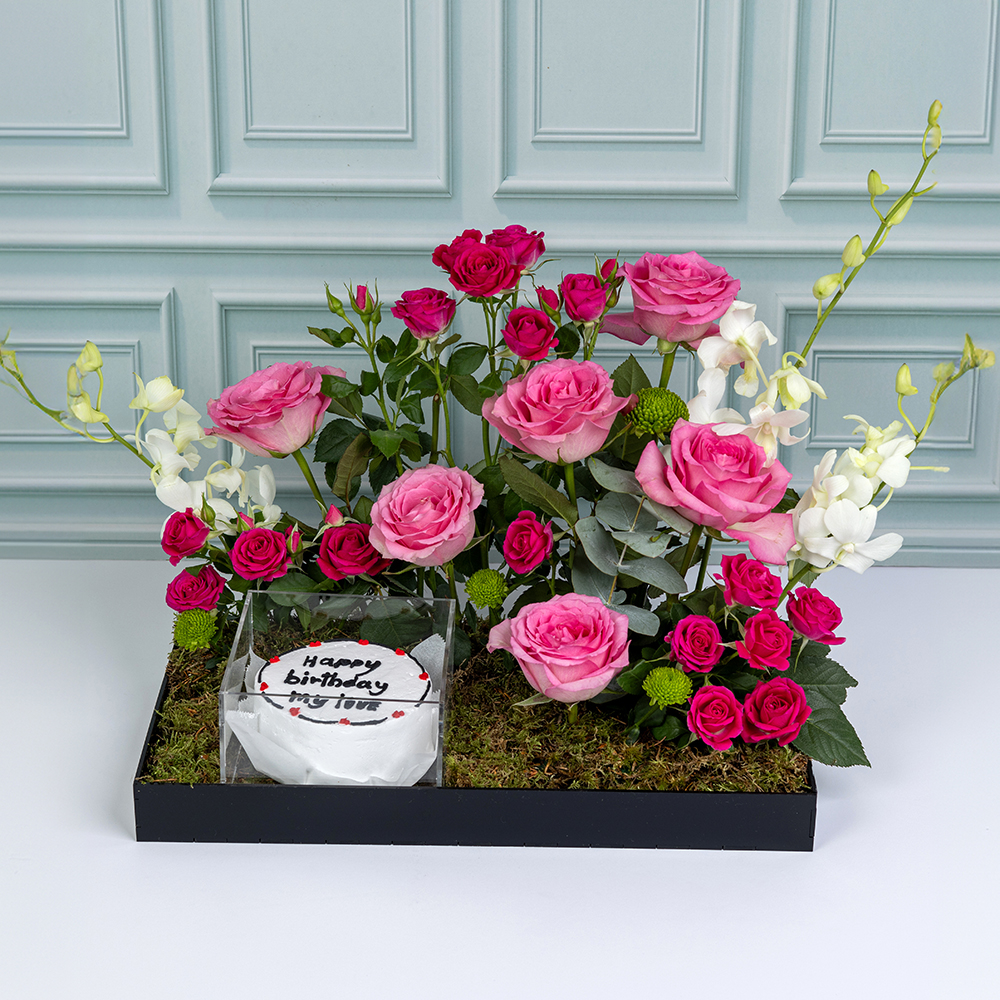 A reflective glass tray with tulips, baby roses and alstroemeria with a cake. Note: cake writing is customizable.