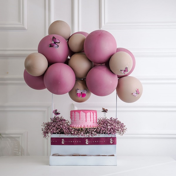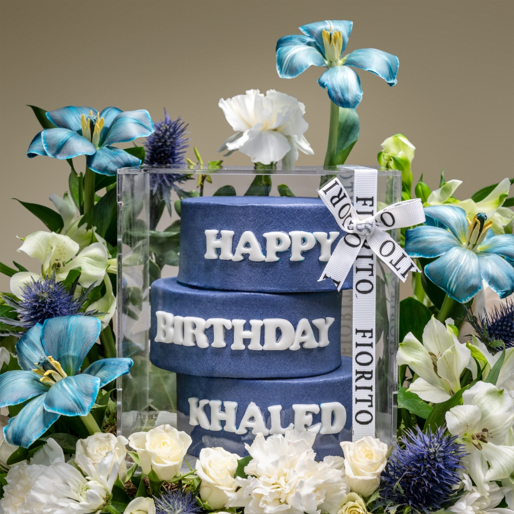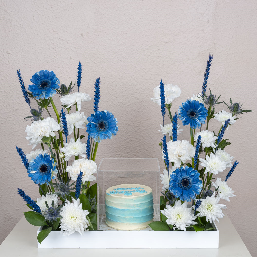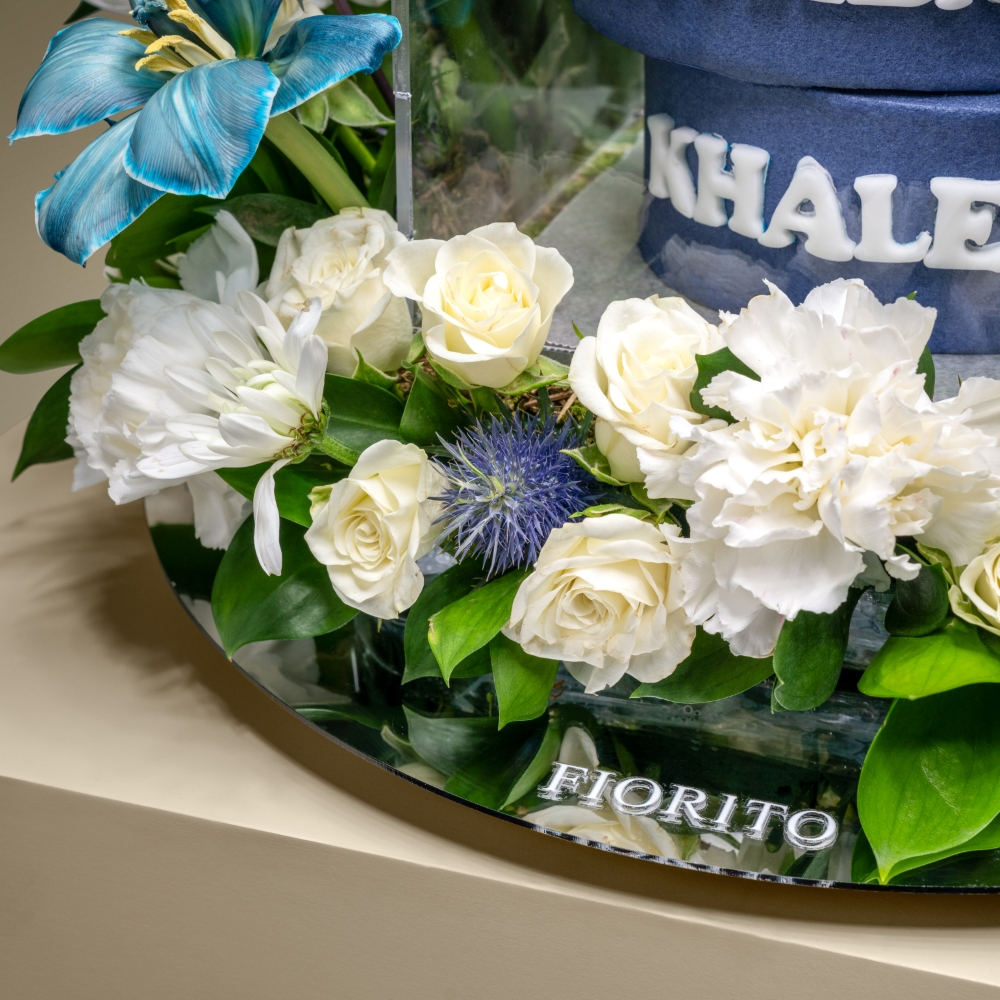 A reflective glass tray with tulips, baby roses and alstroemeria with a cake. Note: cake writing is customizable.