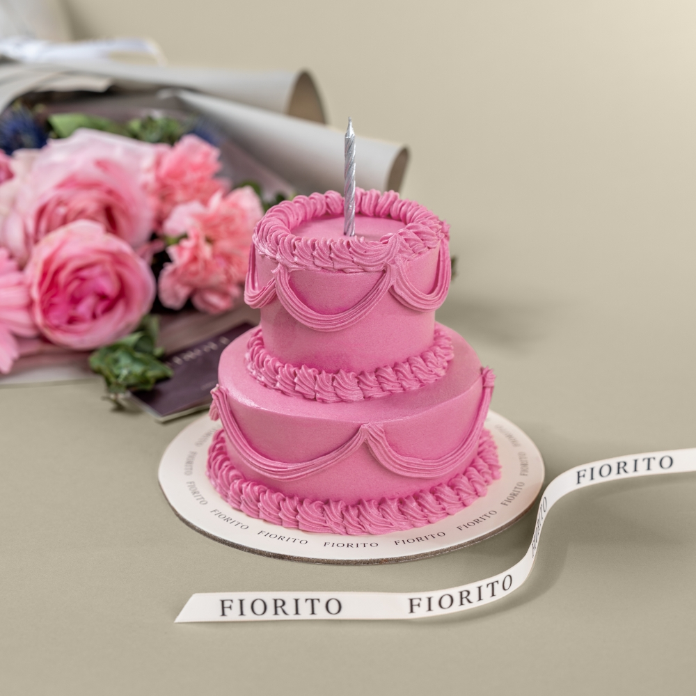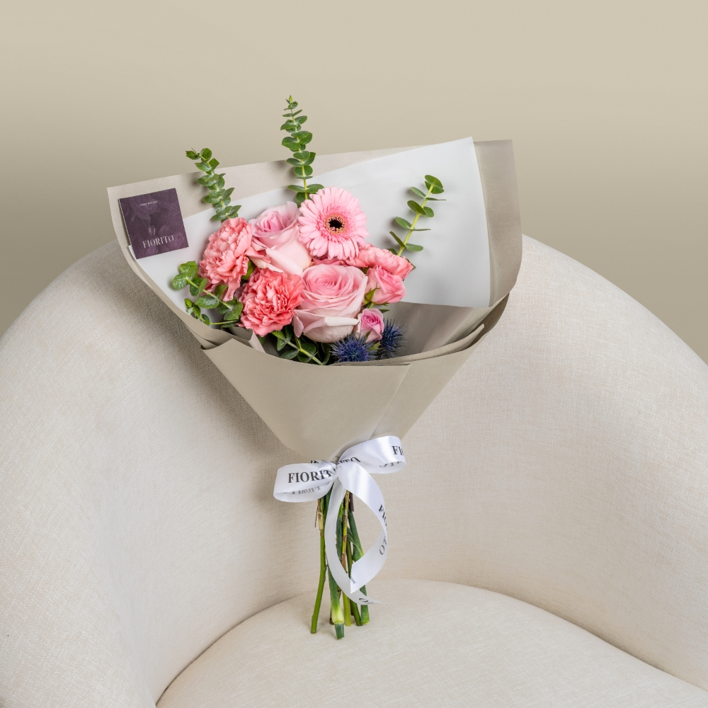 A graceful hand bouquet featuring gerberas, carnations, roses, and baby roses, elegantly accented with soft touches, and paired with a delicate cake. A refined floral gift, perfect for celebrating a special birthday.