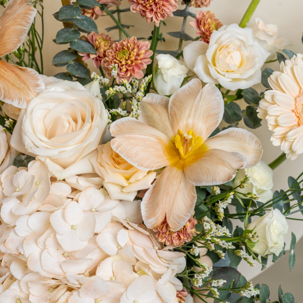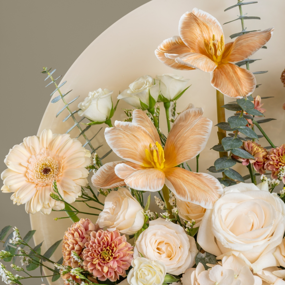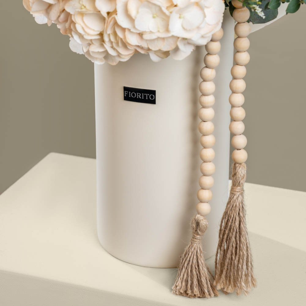 A graceful tall vase featuring tulips, gerbera, roses, hydrangea, and chrysanthemums, elegantly paired with prayer beads for a heartfelt gift of endless love and prayers.