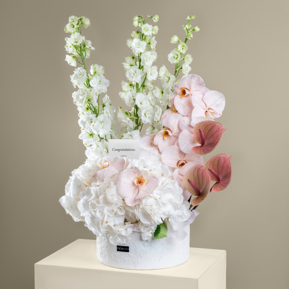 A pot that contains orchids, delphiniums, hydrangeas, and anthuriums, arranged beautifully.
