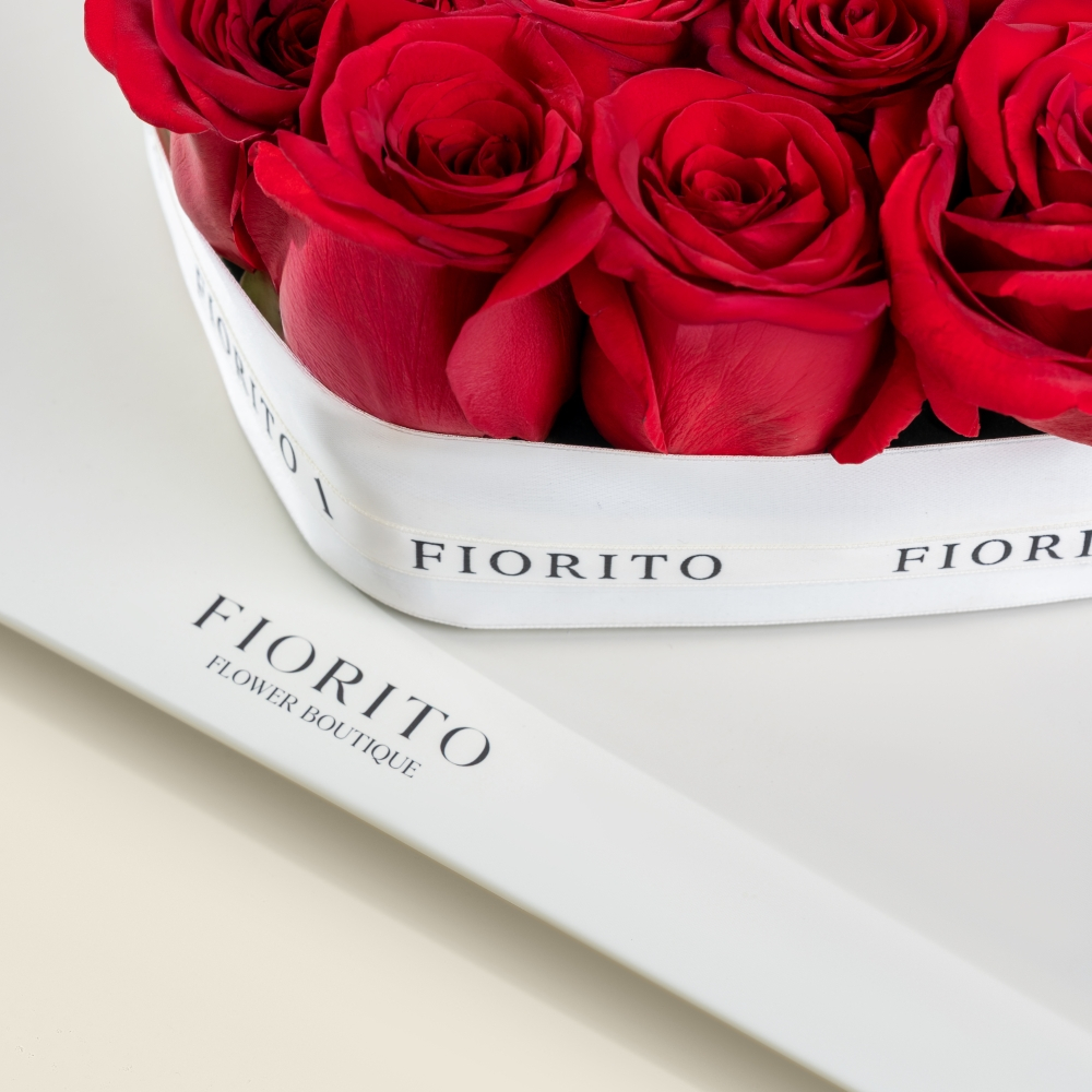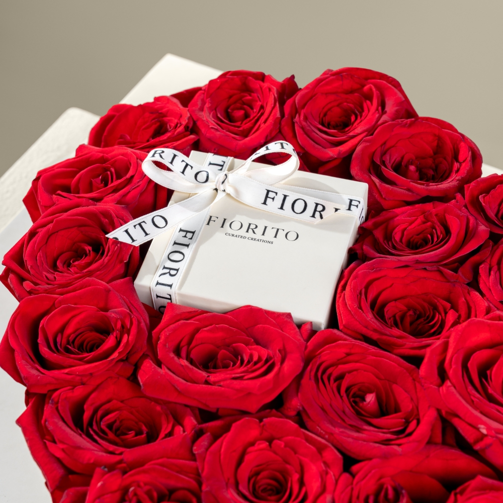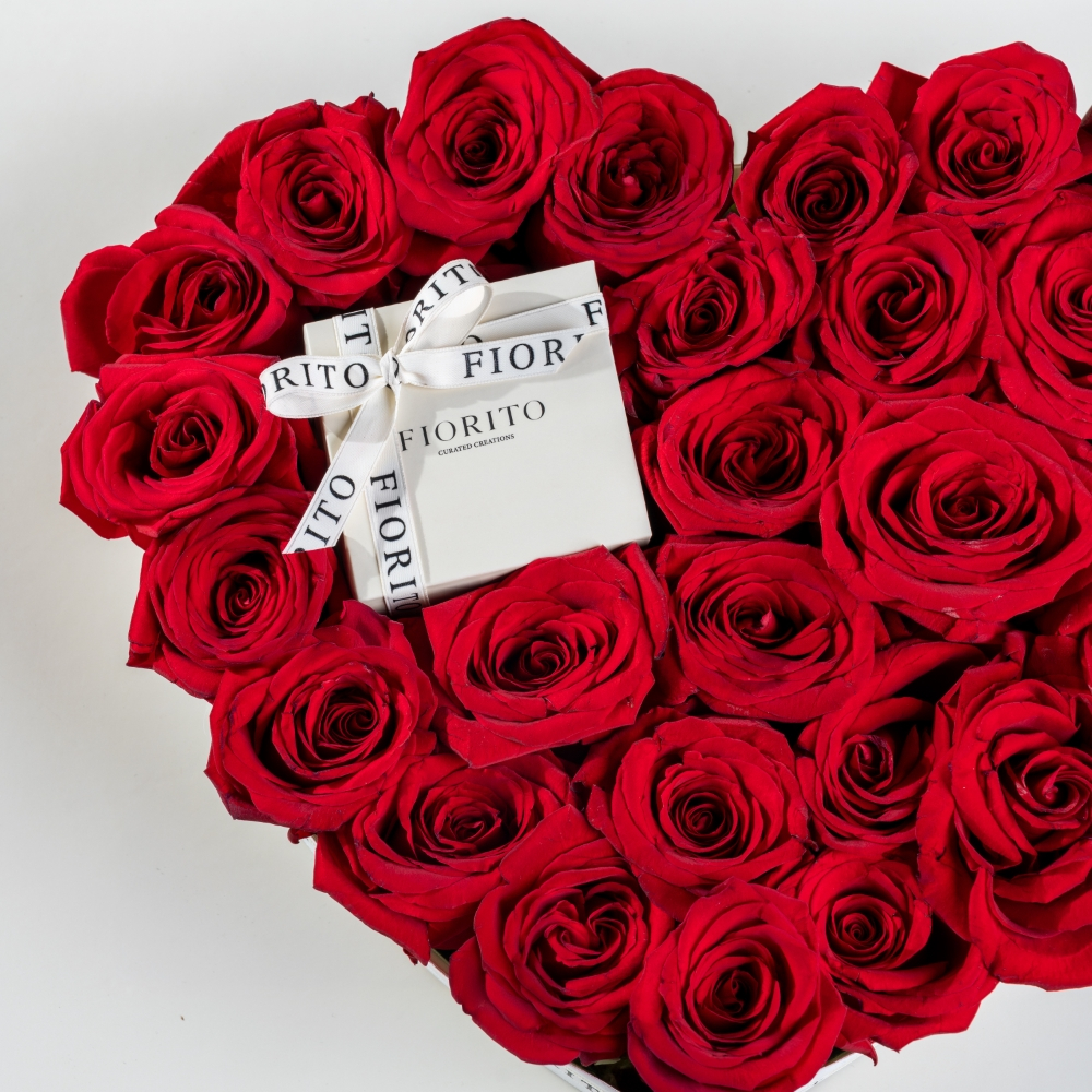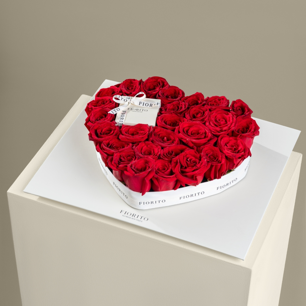 An exquisite tray displaying 26 roses arranged in a heart shape, paired with delicious French chocolates. A timeless symbol of deep romance and devotion.