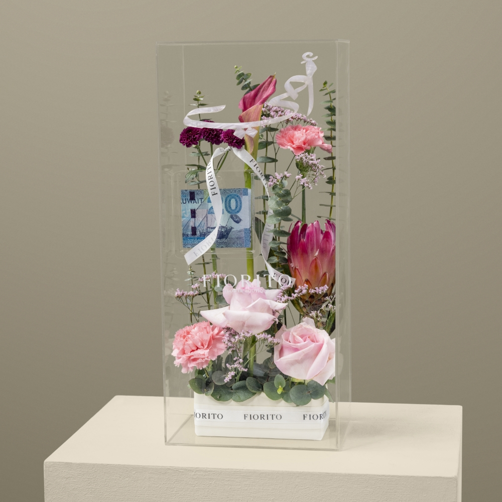 A refined tray featuring calla lilies, roses, chrysanthemums, proteas, and carnations, elegantly arranged with an acrylic cash gift box and a special Mother's Day topper, a meaningful gift that celebrates love and gratitude. (money not included).