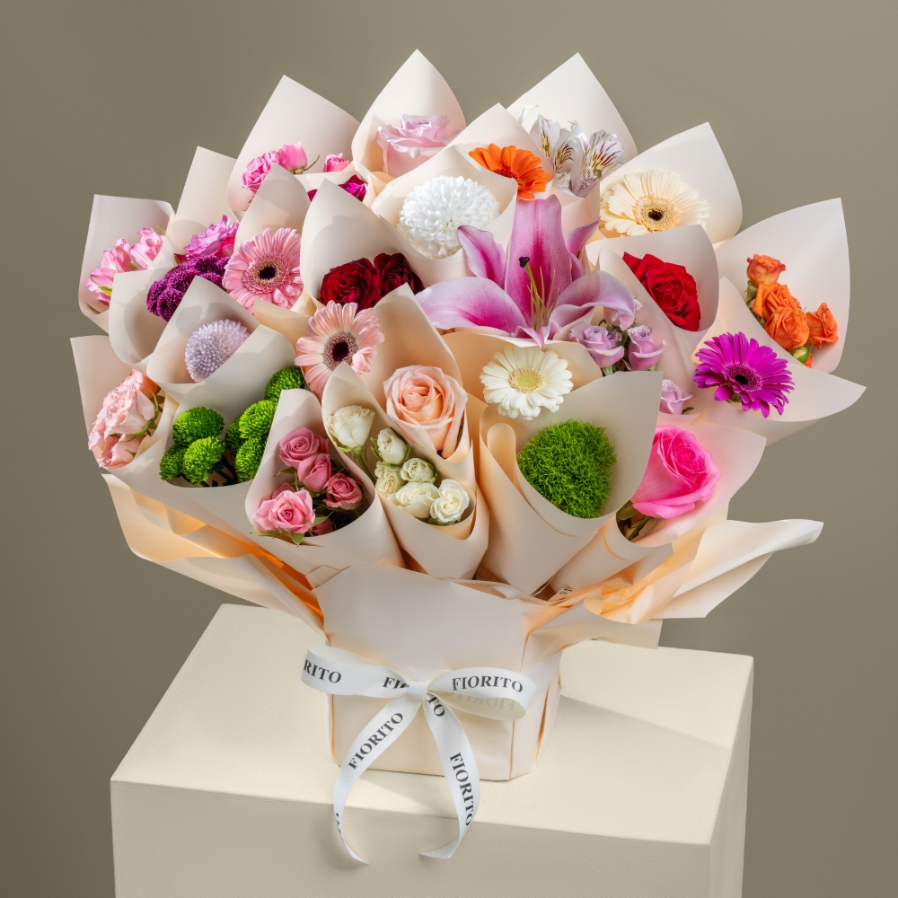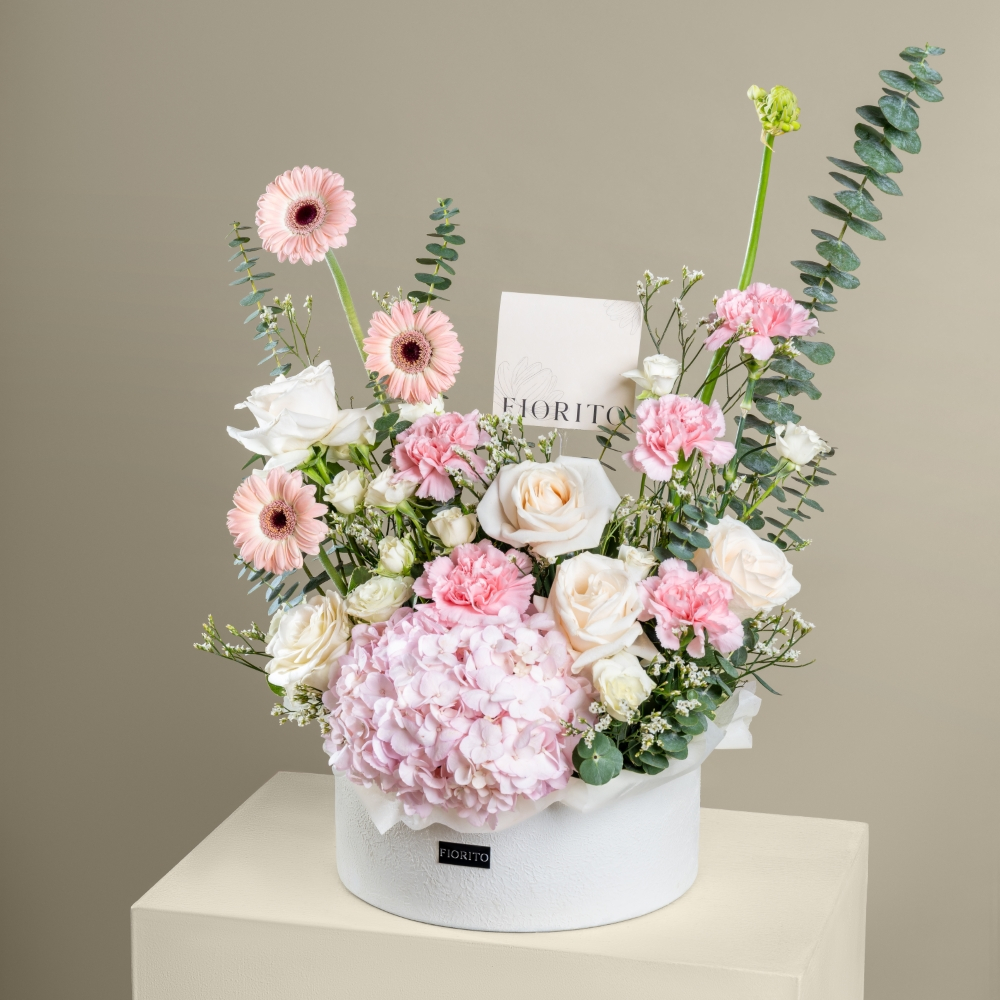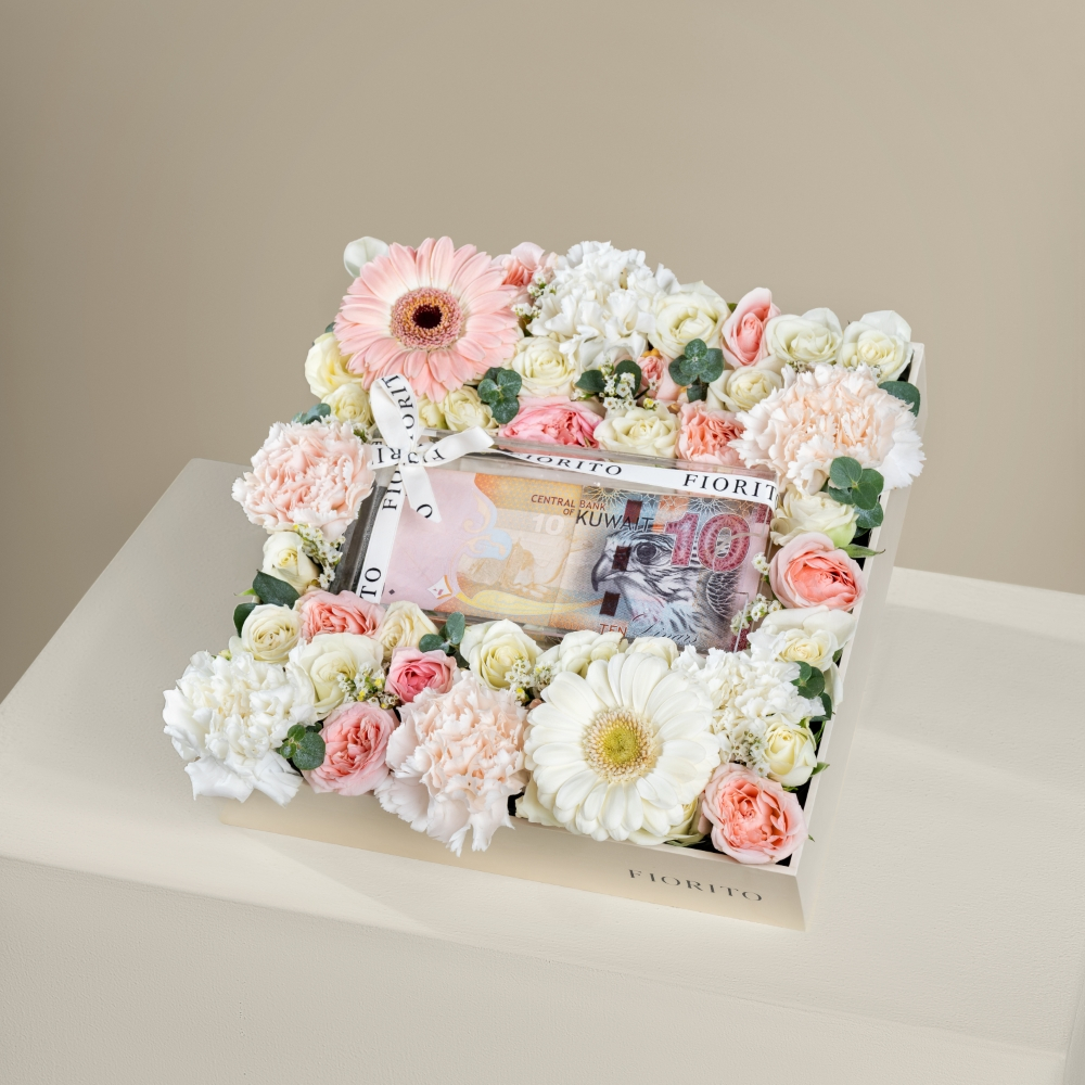A reflective glass tray with baby roses, alstroemeria, gerberas and a cake. A perfect way to send birthday cheer and make their day even more memorable. Note: cake writing is customizable.