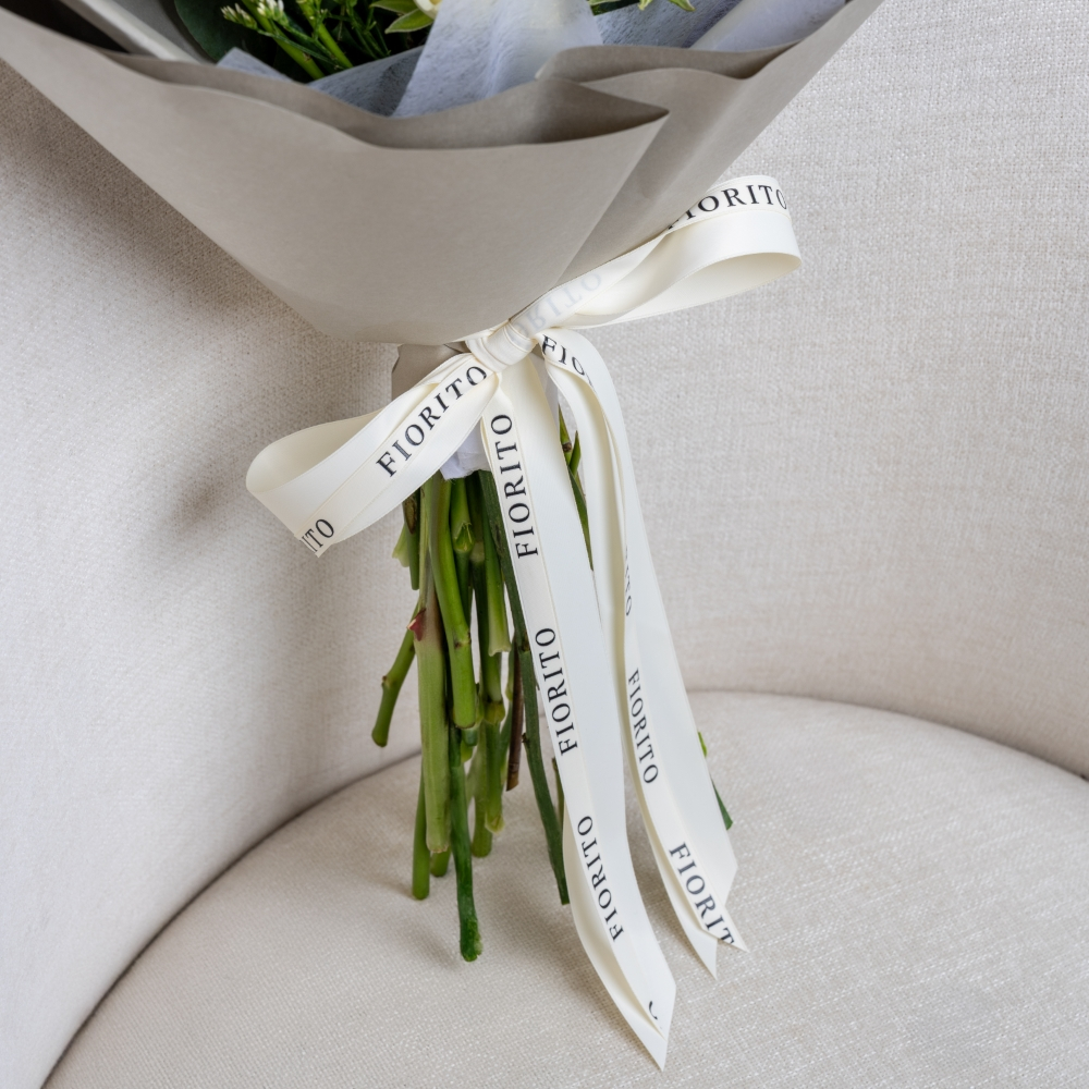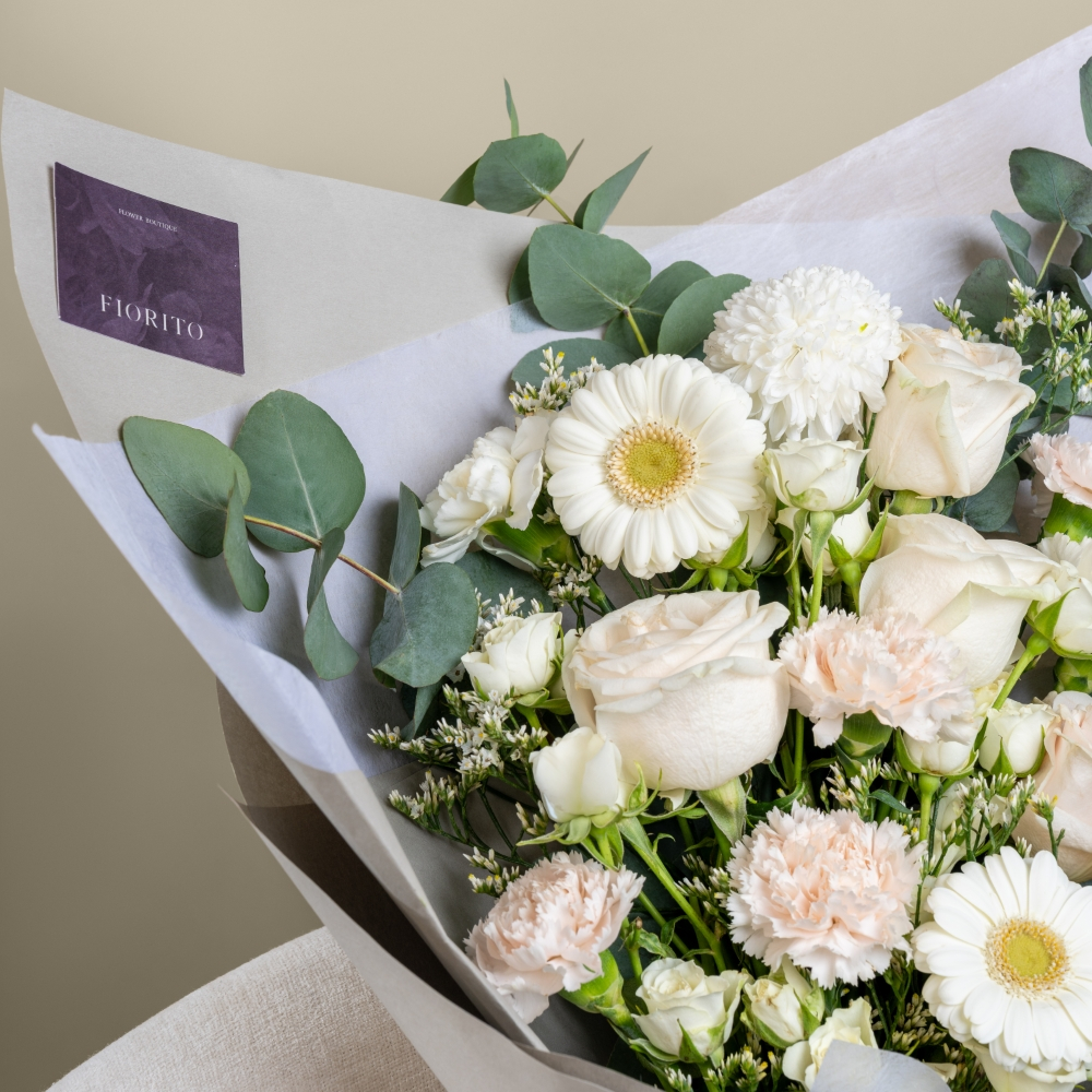 A graceful hand bouquet featuring white baby roses, gerbera, carnations, and chrysanthemums. A serene gift designed to express pure affection and sophistication.
