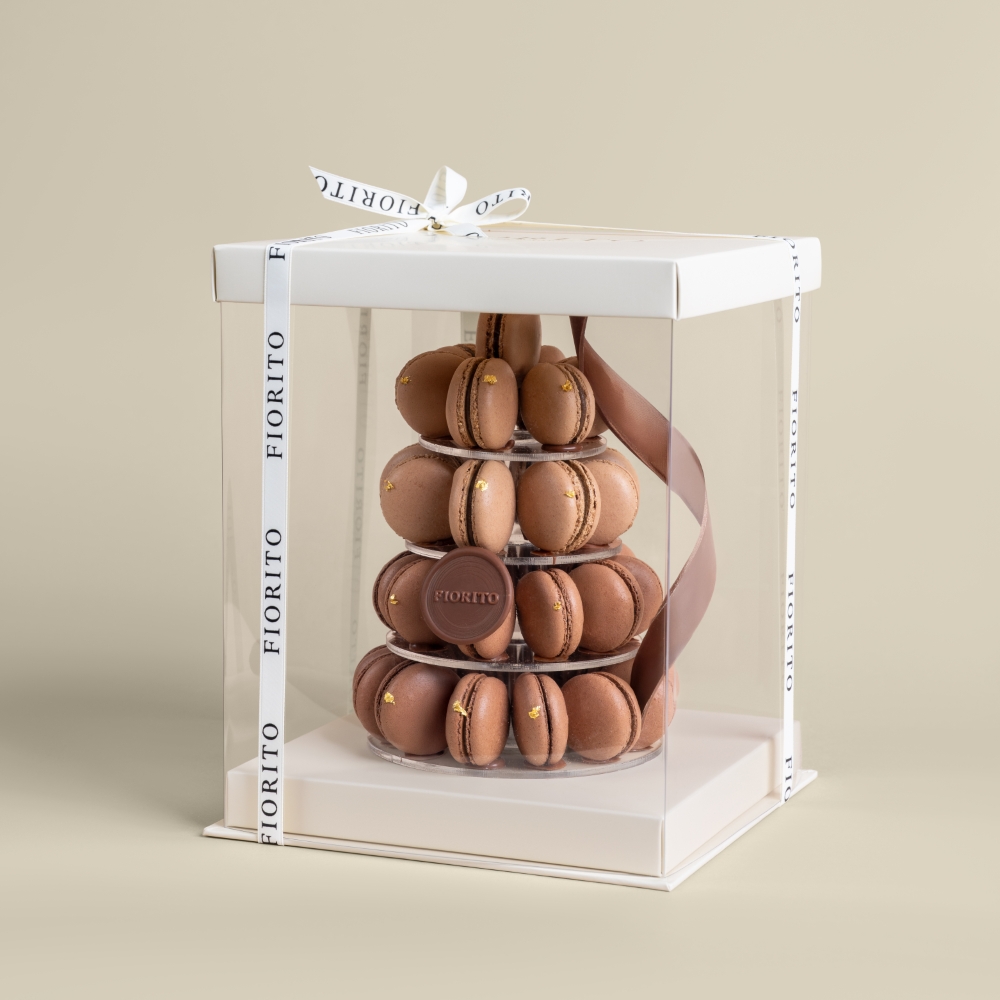 An elegant tray topped with a box featuring rose, gerbera, and carnation flowers, paired with delightful pink macaroons and a box of chocolates, making it a sweet gift perfect for welcoming a new baby or celebrating any special occasion.