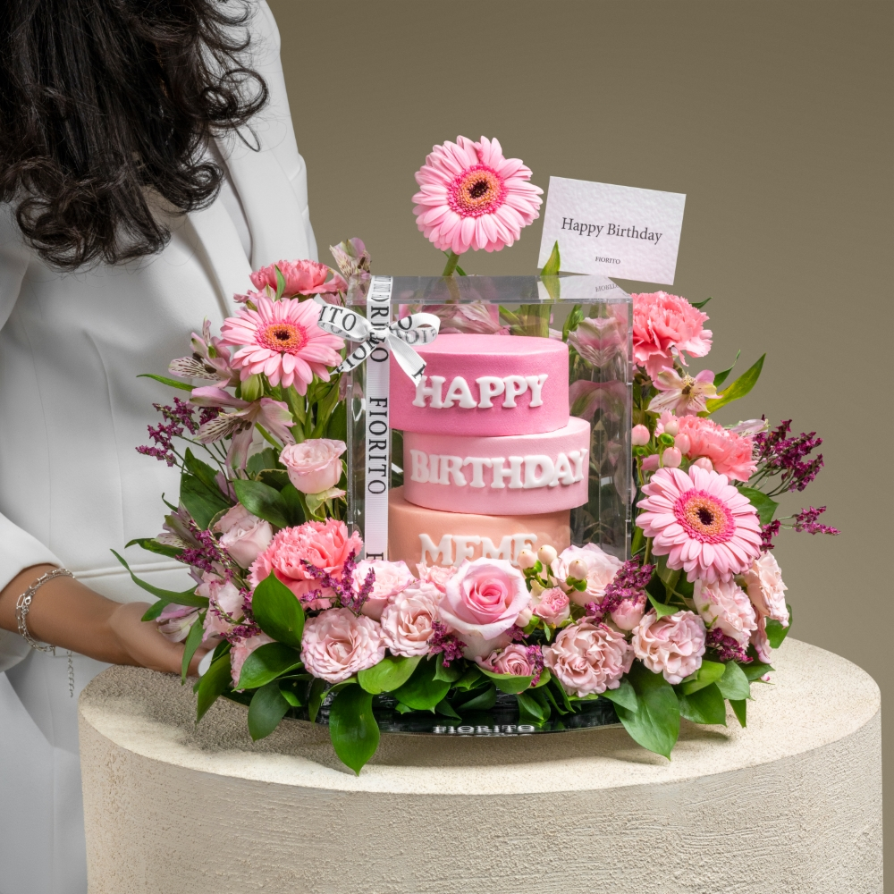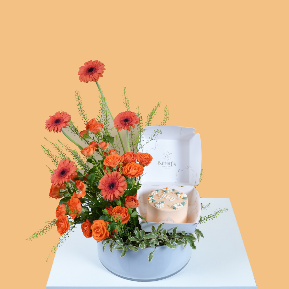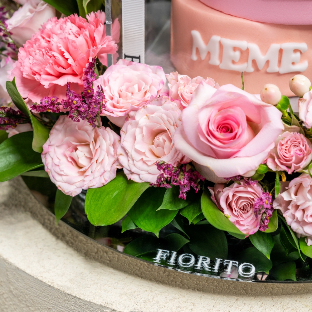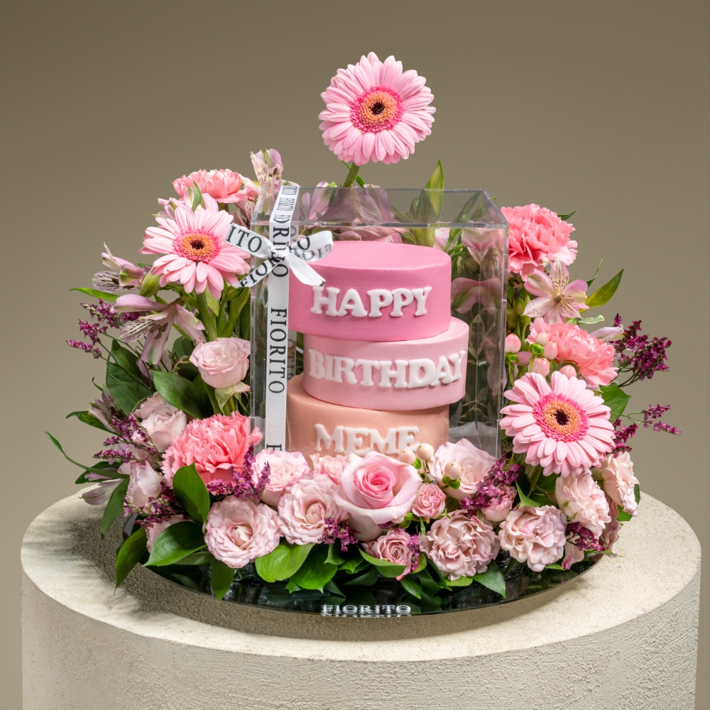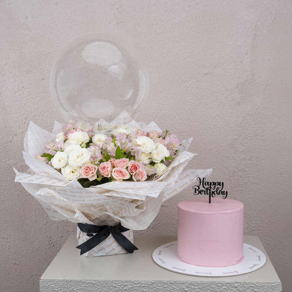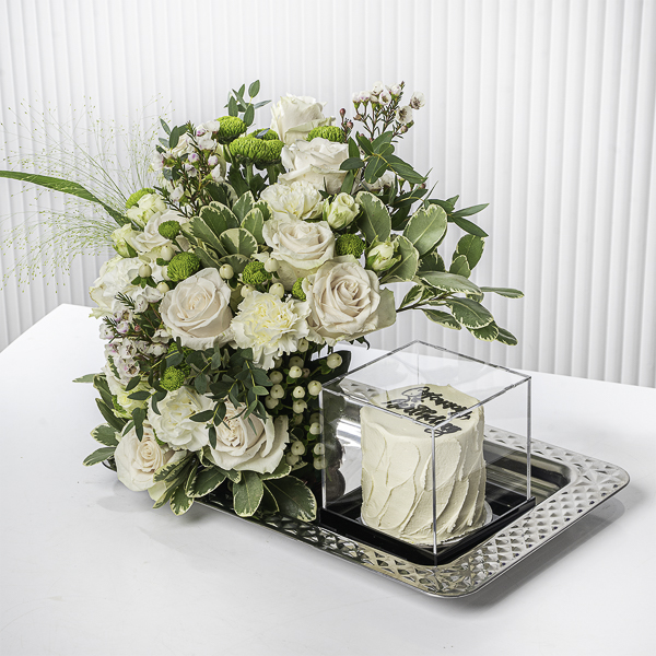 A reflective glass tray with baby roses, alstroemeria, gerberas, and a cake. Note: cake writing is customizable.