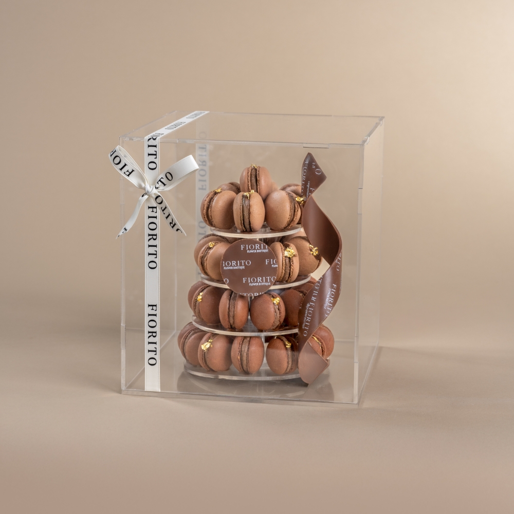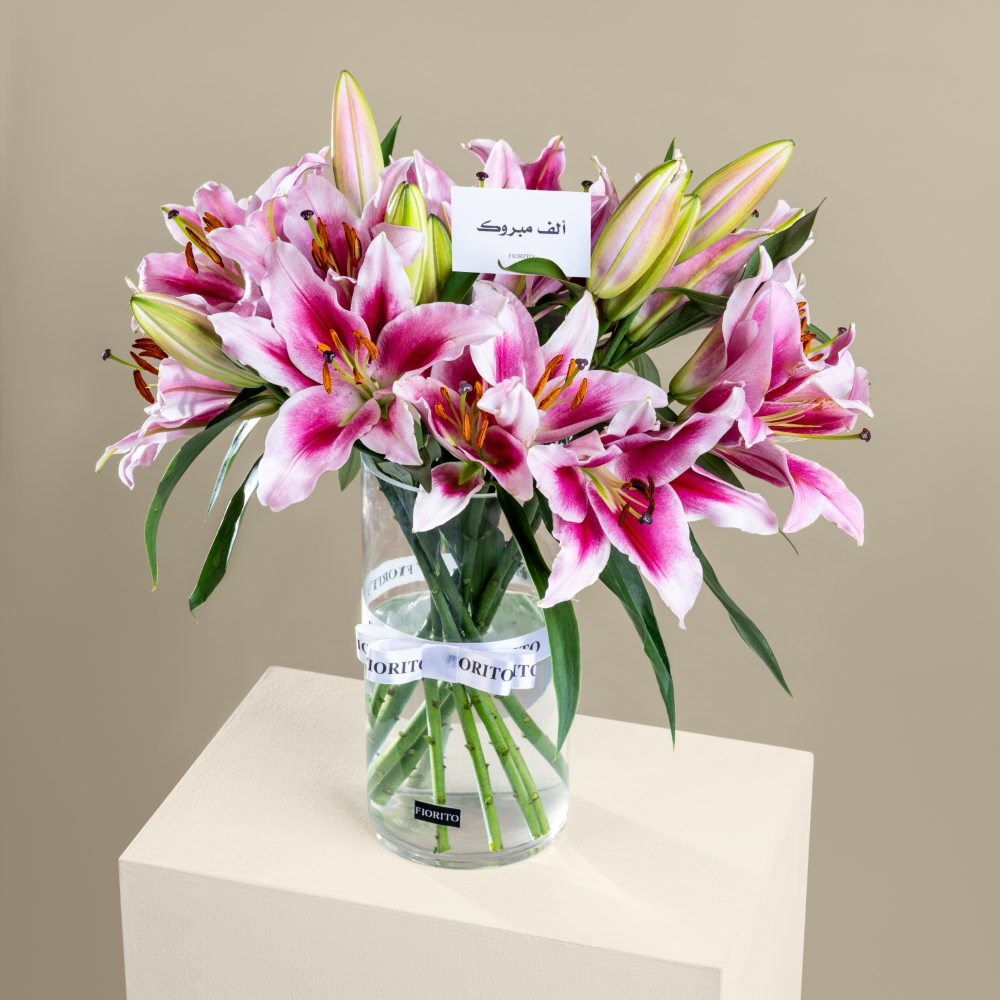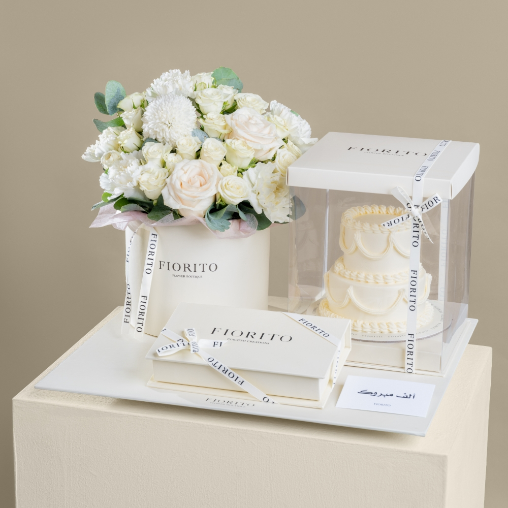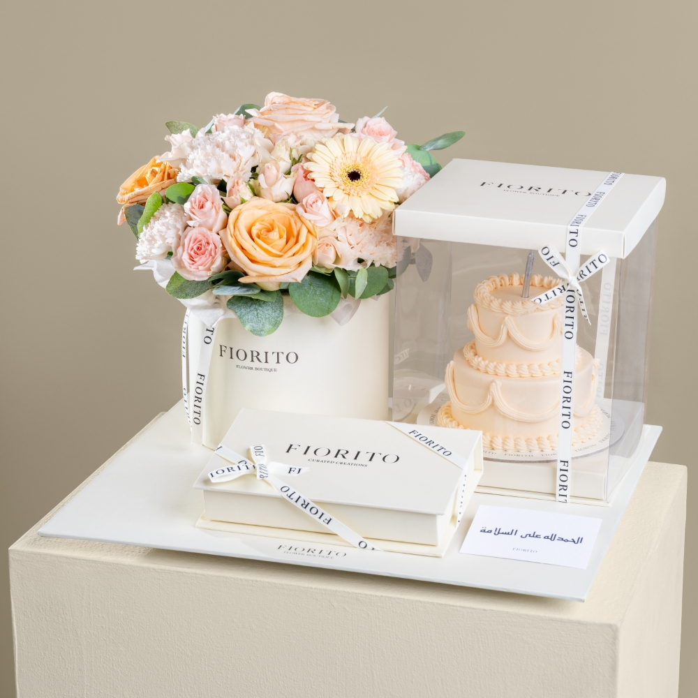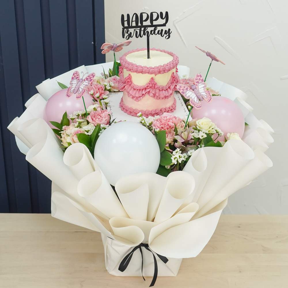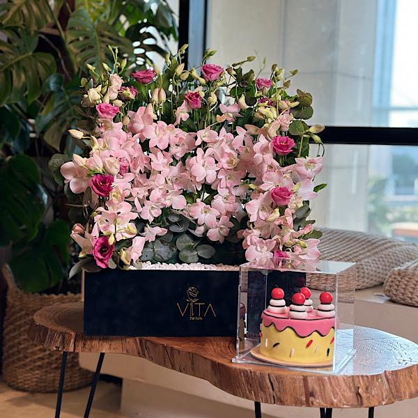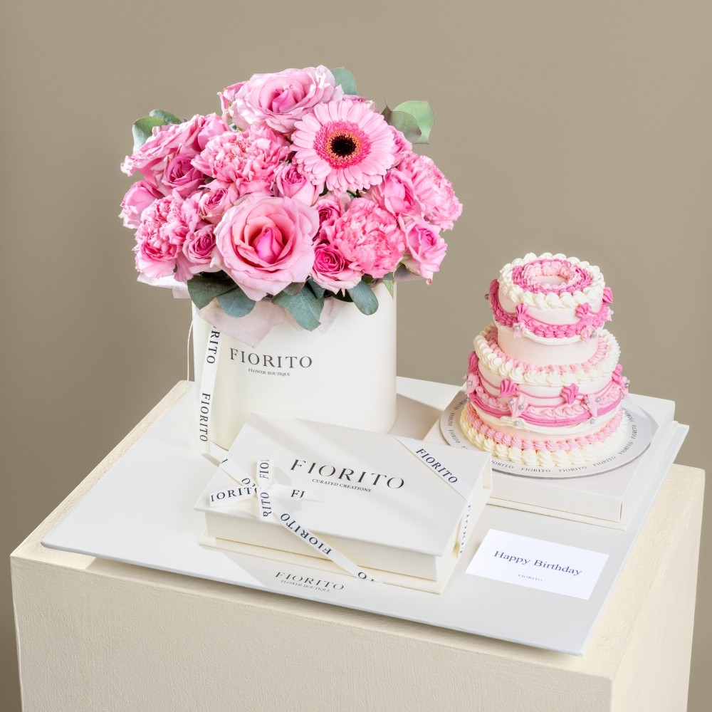 A reflective glass tray with baby roses, alstroemeria, gerberas, and a cake. Note: cake writing is customizable.
