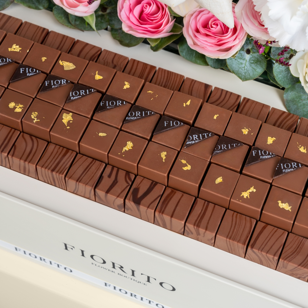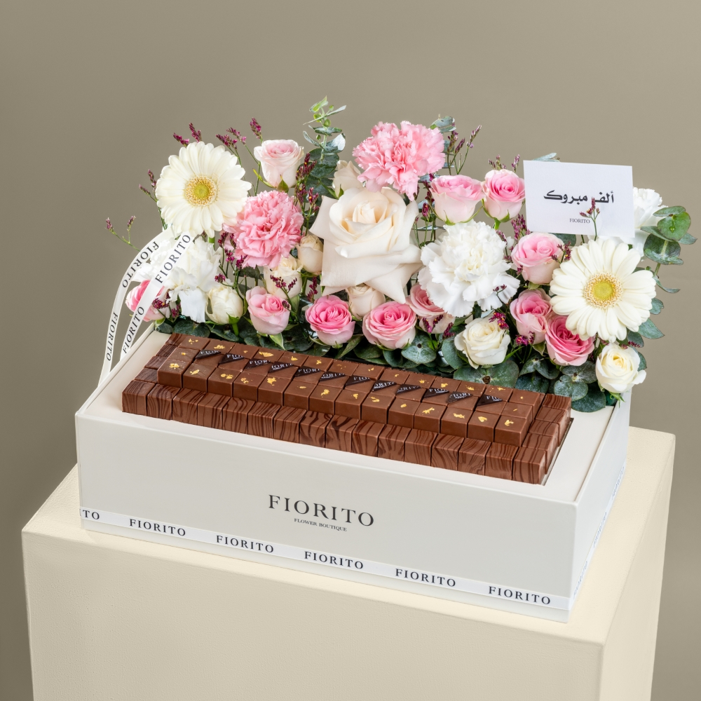 A sophisticated box featuring roses, gerbera, carnations, and baby roses, completed with fine French chocolate of 80 pieces filled with almond, pistachio, biscuits, and pecan caramel. A versatile gift that adds a touch of sweetness to every moment.