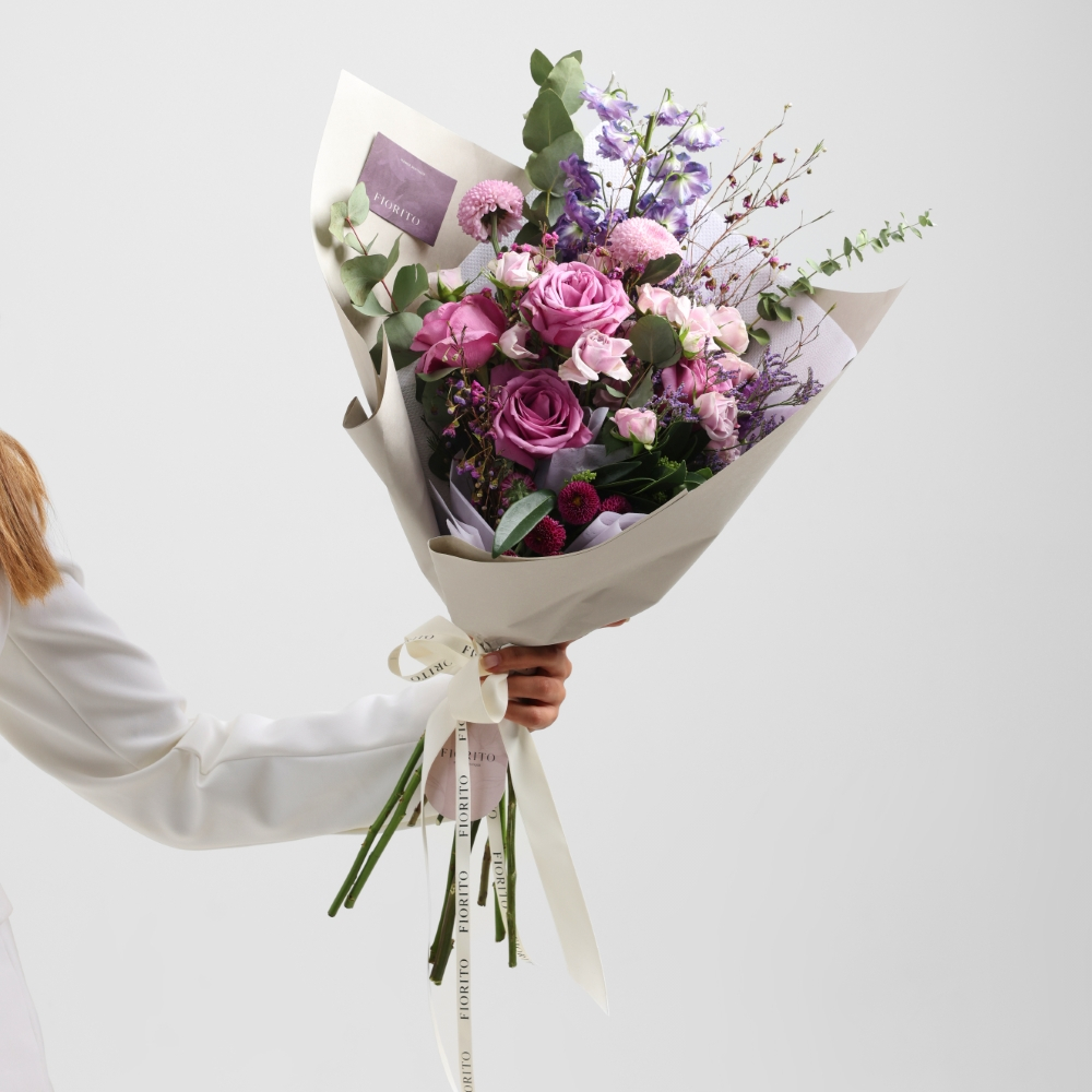 A beautiful bouquet of roses, delphiniums, and chrysanthemums. A perfect gift for any occasion, adding a touch of elegance and joy to life’s special moments.