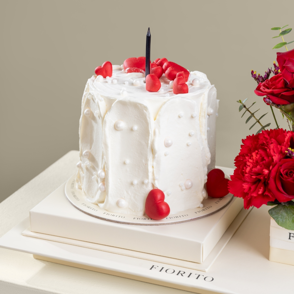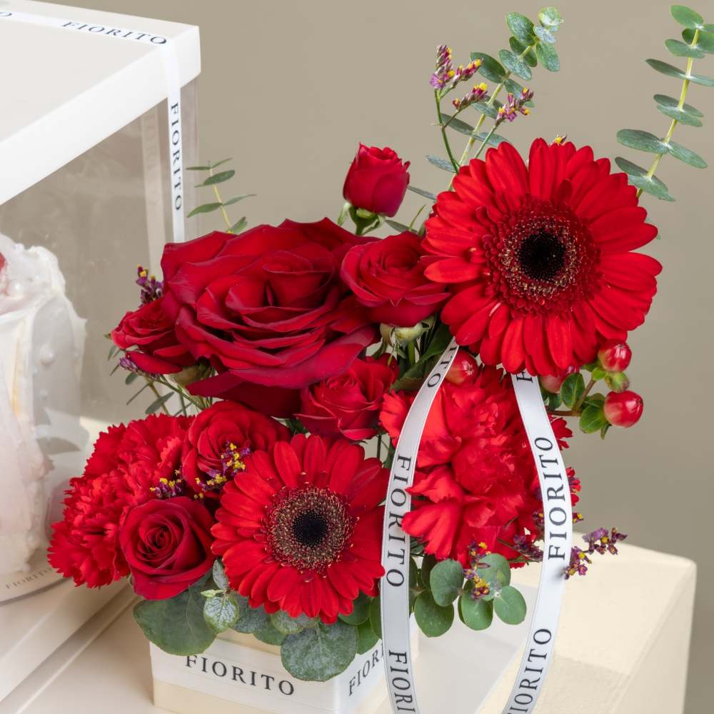 A charming tray featuring roses, carnations, gerberas, and hypericum, paired with a delicious cake. A delightful gift that celebrates love with elegance.