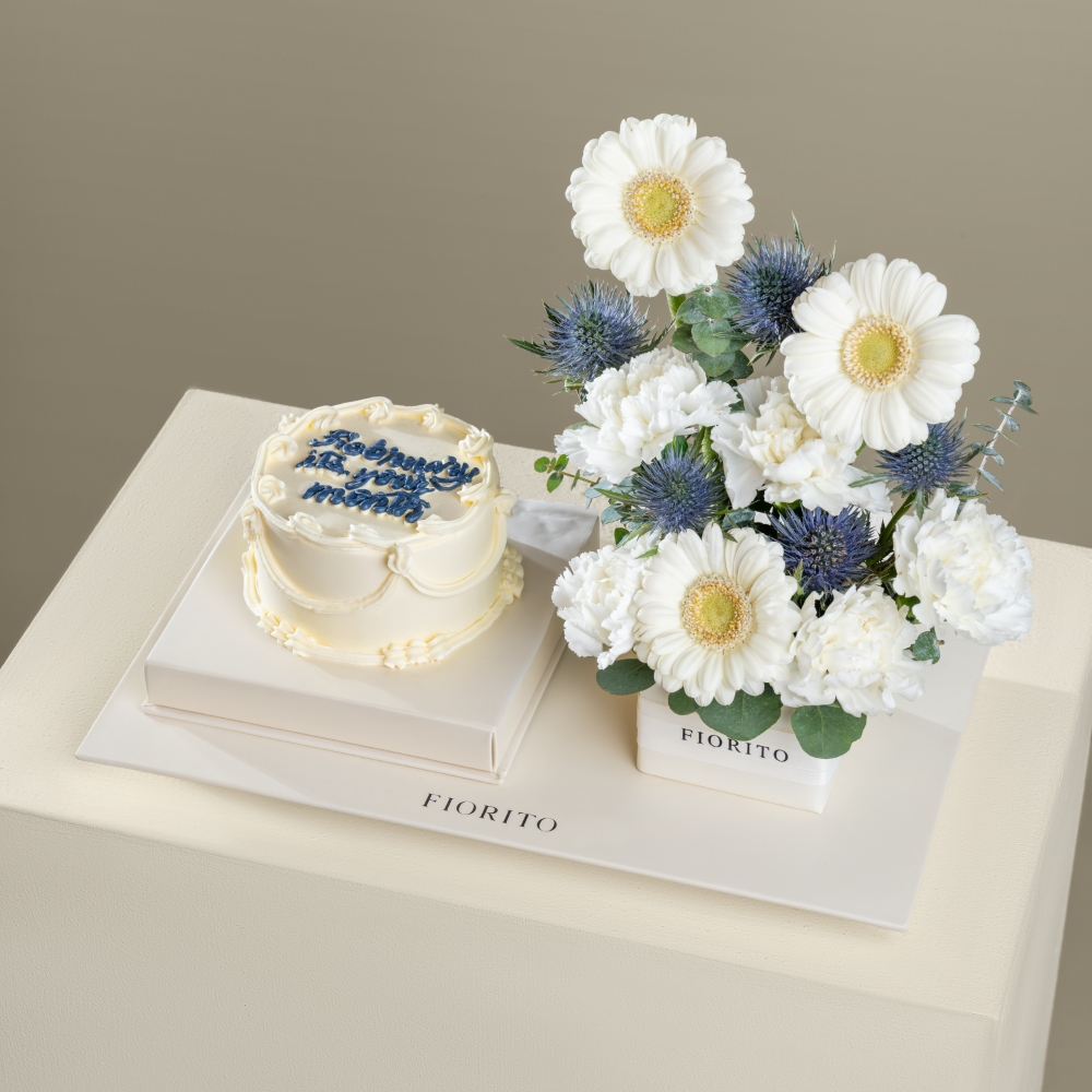 An acrylic tray arranged with carnations, gerberas, and eryngium with a cake. Adds a touch of elegance and draws smiles on their birthdays. Note: cake writing is customizable.