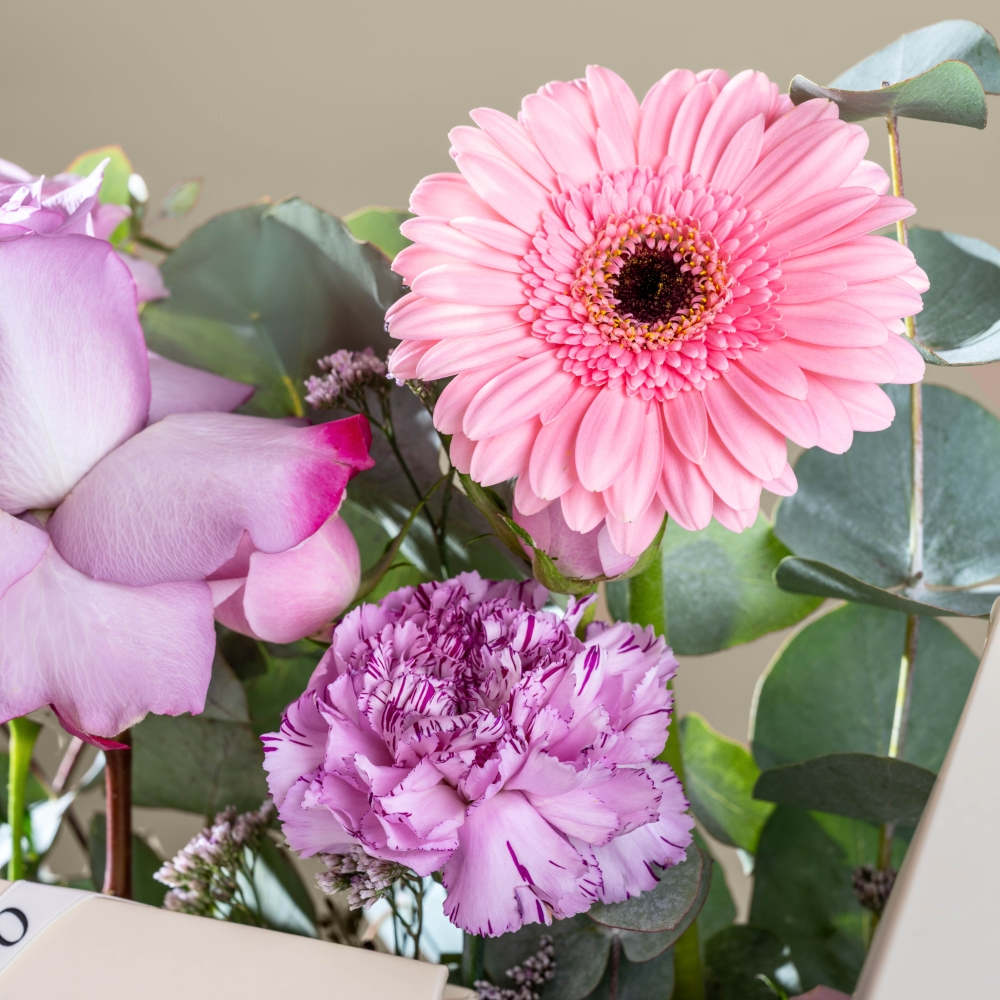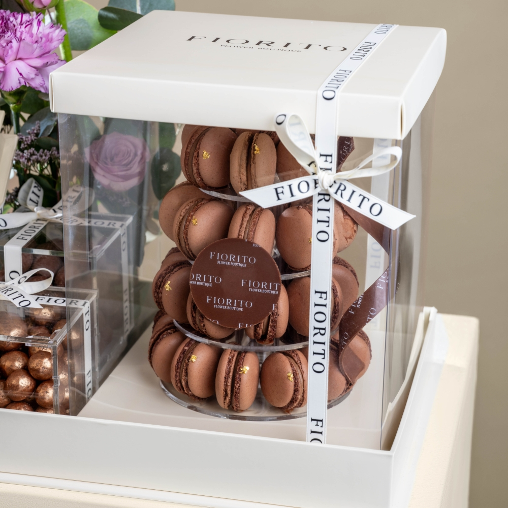 An elegant tray adorned with gerberas, roses, and carnations, featuring a selection of macarons, boxes of chocolate balls, and a box of fine French chocolate. A beautiful harmony of colors and flavors, perfect for any joyful occasion.