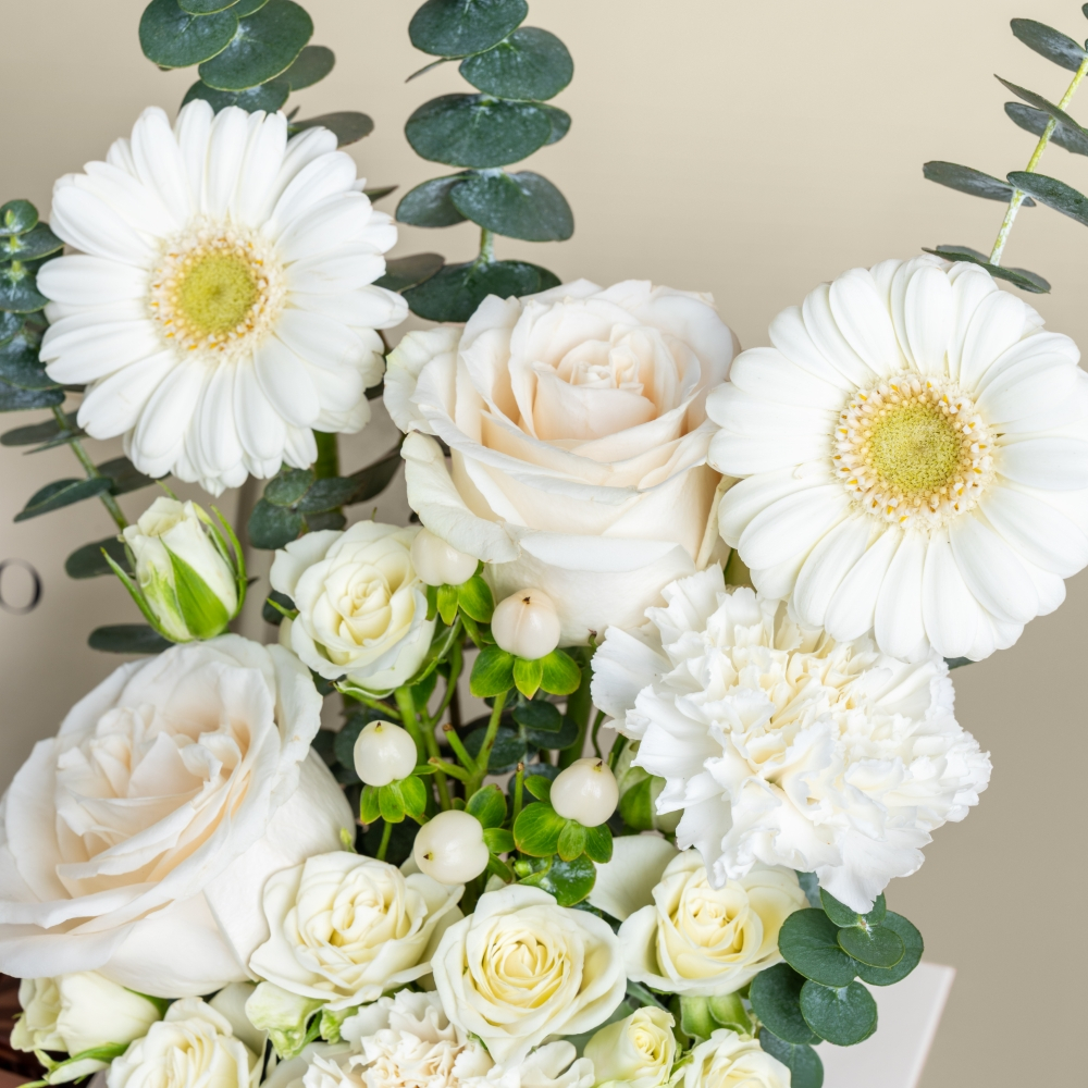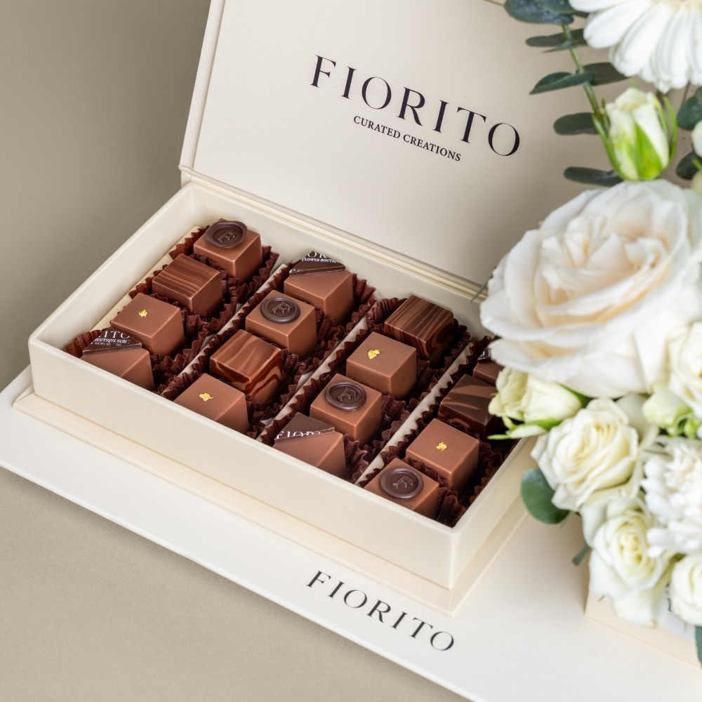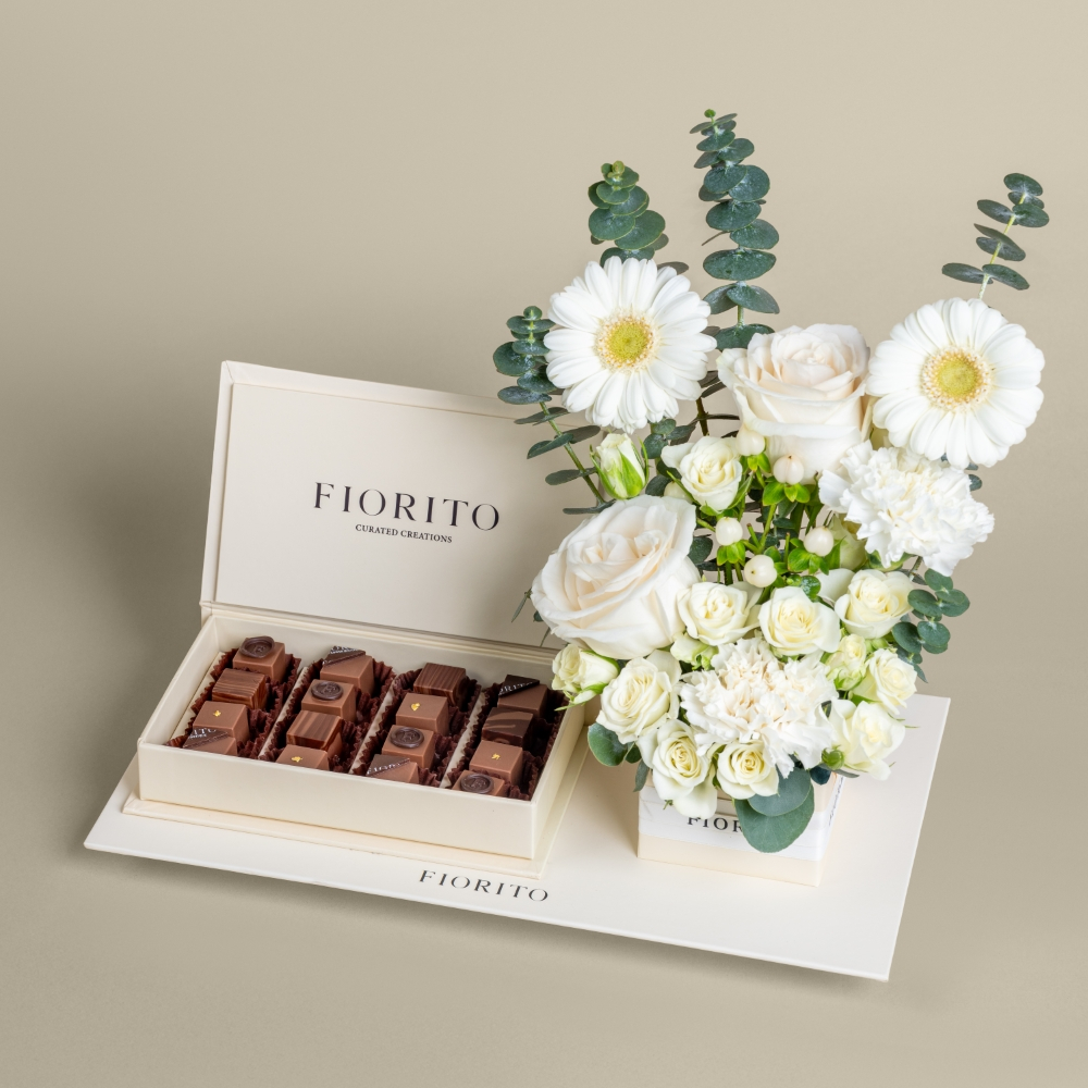 An elegant tray arranged with gerberas, baby roses, carnations, and roses, beautifully presented alongside a French chocolate box, a timeless expression of sweetness.